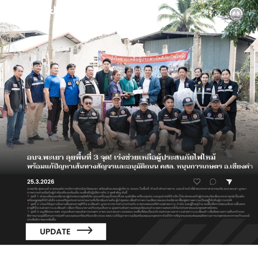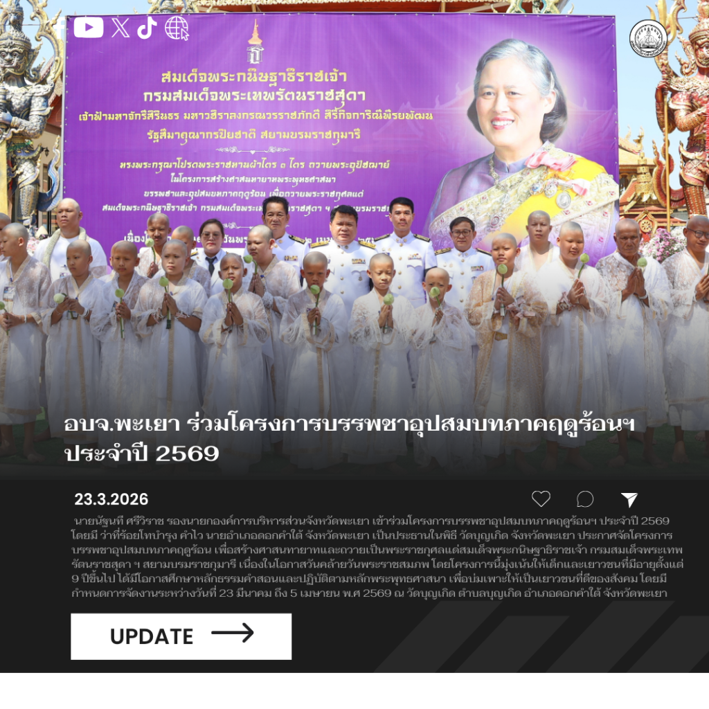 วันที่ 25 มีนาคม 2569 นายธวัช สุทธวงค์ นายกองค์การบริหารส่วนจังหวัดพะเยา มอบหมายให้ นายสยาม ปรีชา ปลัดองค์การบริหารส่วนจังหวัดพะเยา พร้อมด้วย นางธนพรรธน์ สุขตัว หัวหน้าสำนักปลัดฯ และบุคลากร องค์การบริหารส่วนจังหวัดพะเยา เข้าร่วมกิจกรรมเนื่องใน วัน อปพร. ประจำปี 2569 จังหวัดพะเยา โดยมี นางสาวอรอาภา โล่ห์วีระ ผู้ว่าราชการจังหวัดพะเยา เป็นประธาน ณ วัดอนาลโยทิพยาราม ตำบลสันป่าม่วง จังหวัดพะเยา เพื่อยกย่องเชิดชูเกียรติและสร้างขวัญกำลังใจให้แก่เหล่าอาสาสมัครผู้เสียสละในการปฏิบัติหน้าที่ดูแลความปลอดภัยและบรรเทาสาธารณภัยให้แก่พี่น้องประชาชน