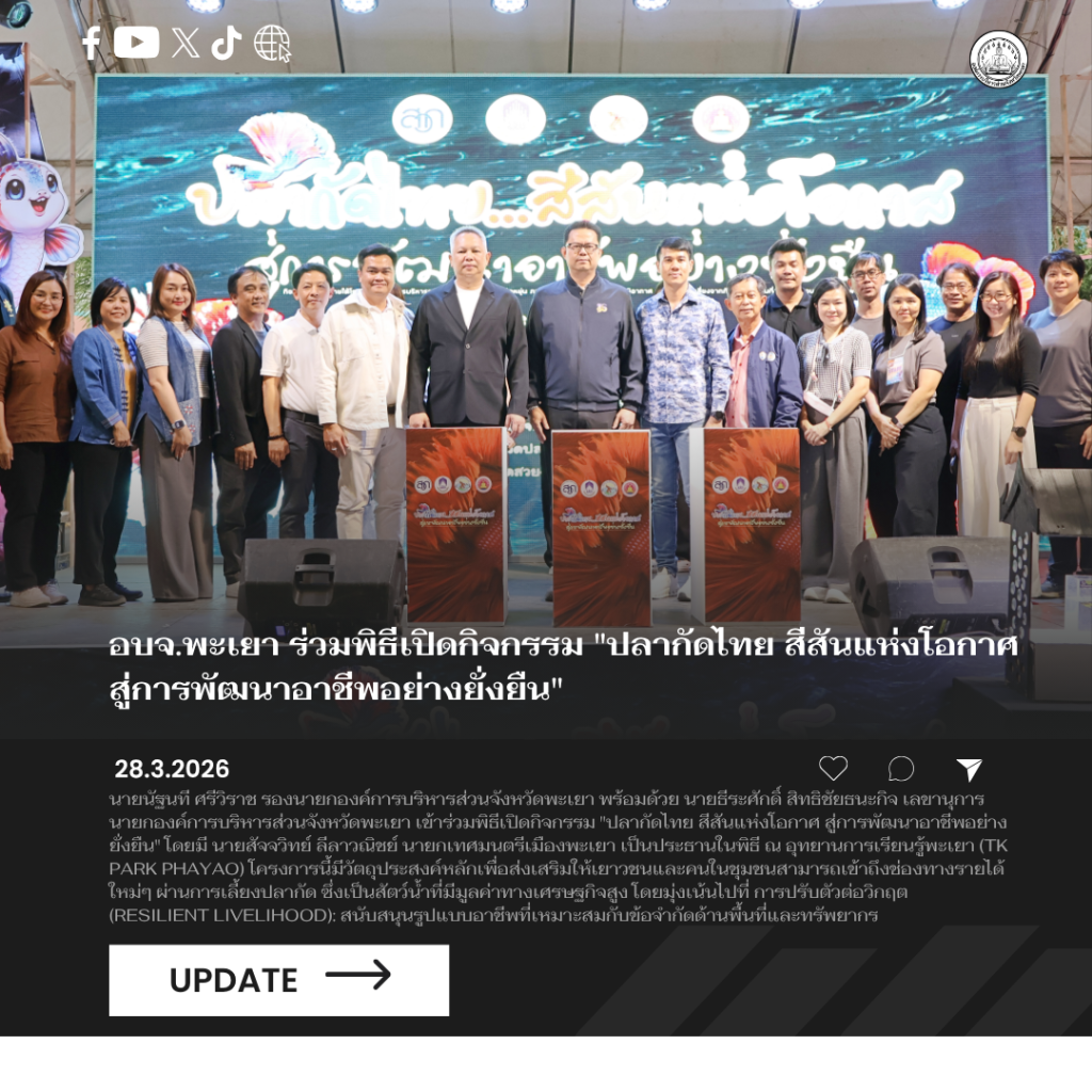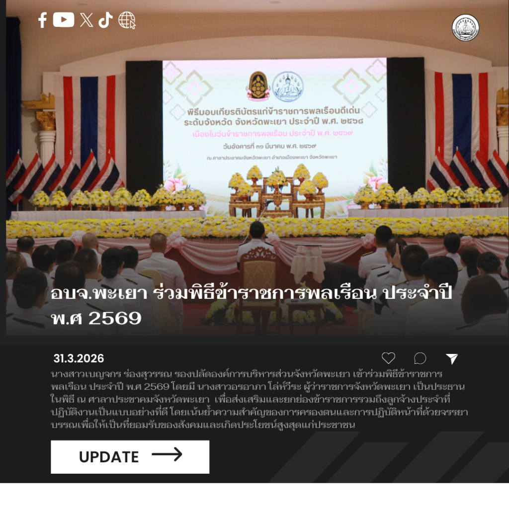 วันที่ 28 มีนาคม 2569 นายธวัช สุทธวงค์ นายกองค์การบริหารส่วนจังหวัดพะเยา มอบหมายให้ นางสาวเบญจกร ร่องสุวรรณ รองปลัดองค์การบริหารส่วนจังหวัดพะเยา พร้อมด้วย นายฐิติวัชร์ ตันตละ รองประธานสภาองค์การบริหารส่วนจังหวัดพะเยา เข้าร่วมพิธีเปิดและทีมบุคลากร อบจ.พะเยา ร่วมแข่งขันกิจกรรม Night Run @Phayao โครงการส่งเสริมการท่องเที่ยวเชิงสุขภาพ กิจกรรมหลัก ส่งเสริมการท่องเที่ยวเชิงสุขภาพ โดยมี นางสาวอรอาภา โล่ห์วีระ ผู้ว่าราชการจังหวัดพะเยา เป็นประธานในพิธี ณ ลานอนุสาวรีย์พ่อขุนงำเมือง