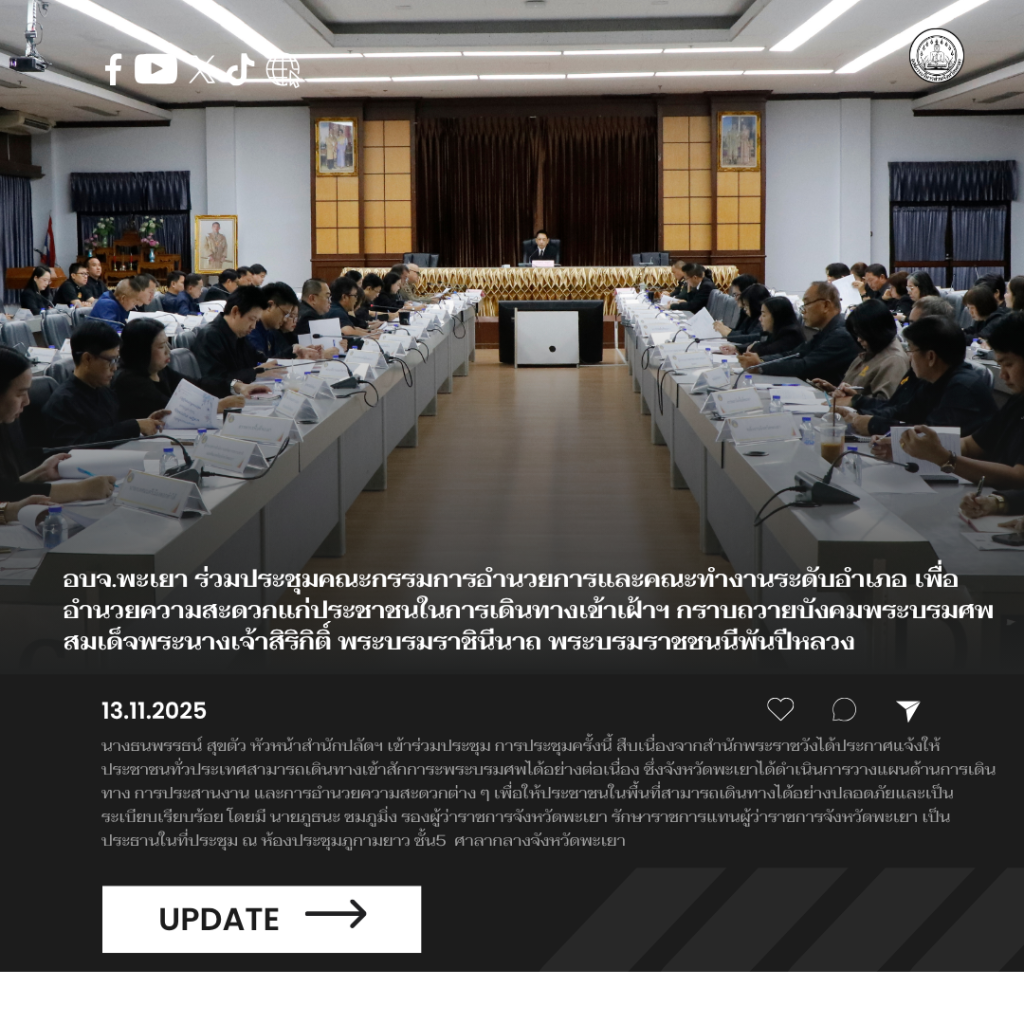 วันที่ 13 พฤศจิกายน 2568 นายธวัช สุทธวงค์ นายกองค์การบริหารส่วนจังหวัดพะเยา ได้มอบหมายให้ นางธนพรรธน์ สุขตัว หัวหน้าสำนักปลัดฯ ร่วมประชุมคณะกรรมการอำนวยการอำนวยความสะดวกแก่ประชาชน และคณะทำงานระดับอำเภอ เพื่อเตรียมความพร้อมในการอำนวยความสะดวกให้ประชาชนเดินทางเข้าเฝ้าฯ กราบถวายบังคมพระบรมศพ สมเด็จพระนางเจ้าสิริกิติ์ พระบรมราชินีนาถ พระบรมราชชนนีพันปีหลวง