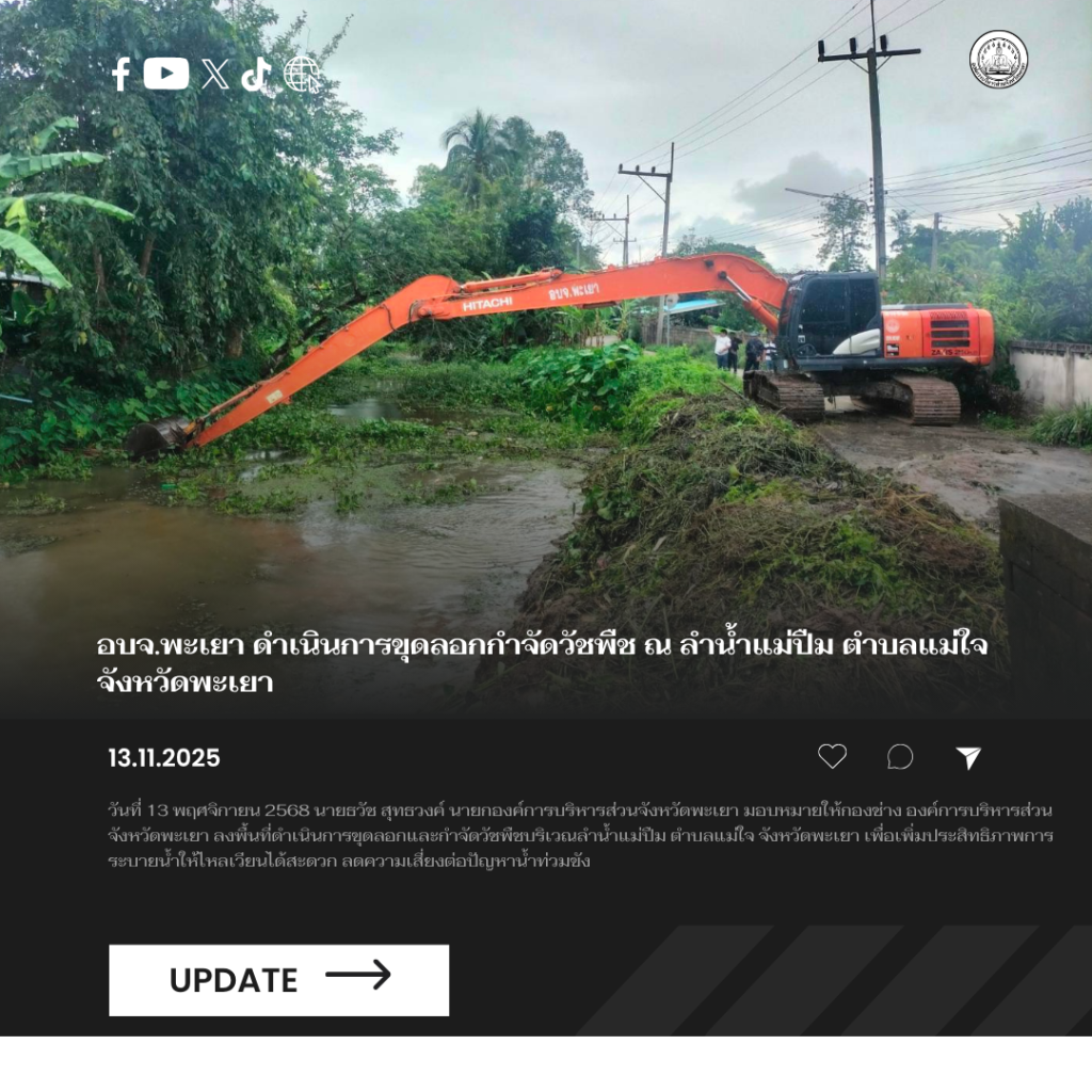 วันที่ 13 พฤศจิกายน 2568 นายธวัช สุทธวงค์ นายกองค์การบริหารส่วนจังหวัดพะเยา มอบหมายให้กองช่าง องค์การบริหารส่วนจังหวัดพะเยา ลงพื้นที่ดำเนินการขุดลอกและกำจัดวัชพืชบริเวณลำน้ำแม่ปืม ตำบลแม่ใจ จังหวัดพะเยา เพื่อเพิ่มประสิทธิภาพการระบายน้ำให้ไหลเวียนได้สะดวก ลดความเสี่ยงต่อปัญหาน้ำท่วมขัง