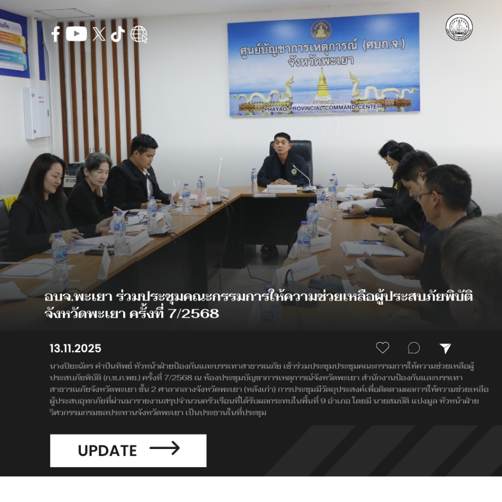 วันที่ 13 พฤศจิกายน 2568 นายธวัช สุทธวงค์ นายก อบจ.พะเยา มอบหมายให้ นางปิยะฉัตร คำปันทิพย์ หัวหน้าฝ่ายป้องกันและบรรเทาสาธารณภัย เข้าร่วมประชุมประชุมคณะกรรมการให้ความช่วยเหลือผู้ประสบภัยพิบัติ (ก.ช.ภ.พย.) ครั้งที่ 7/2568 ณ ห้องประชุมบัญชาการเหตุการณ์จังหวัดพะเยา สำนักงานป้องกันและบรรเทาสาธารณภัยจังหวัดพะเยา ชั้น 2 ศาลากลางจังหวัดพะเยา (หลังเก่า)