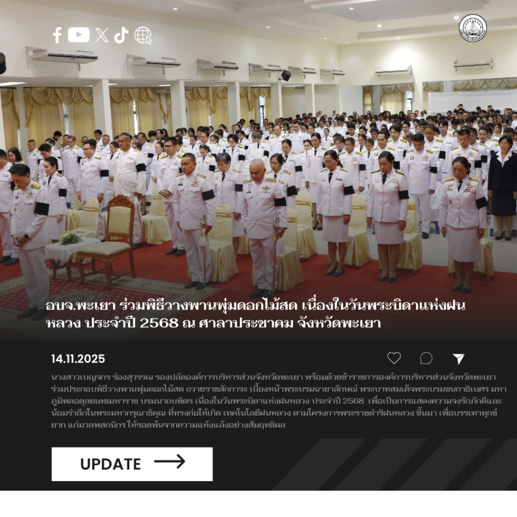 วันที่ 14 พฤจิกายน 2568 นายธวัช สุทธวงค์ นายกองค์การบริหารส่วนจังหวัดพะเยา มอบหมายให้ นางสาวเบญจกร ร่องสุวรรณ รองปลัดองค์การบริหารส่วนจังหวัดพะเยา พร้อมด้วยข้าราชการองค์การบริหารส่วนจังหวัดพะเยา ร่วมประกอบพิธีวางพานพุ่มดอกไม้สด ถวายราชสักการะ เบื้องหน้าพระบรมฉายาลักษณ์ พระบาทสมเด็จพระบรมชนกาธิเบศร มหาภูมิพลอดุลยเดชมหาราช บรมนาถบพิตร เนื่องในวันพระบิดาแห่งฝนหลวง ประจำปี 2568 เพื่อเป็นการแสดงความจงรักภักดีและน้อมรำลึกในพระมหากรุณาธิคุณ ที่ทรงก่อให้เกิด เทคโนโลยีฝนหลวง ตามโครงการพระราชดำริฝนหลวง ขึ้นมา เพื่อบรรเทาทุกข์ยาก แก่มวลพสกนิกร ให้รอดพ้นจากความแห้งแล้งอย่างสัมฤทธิผล