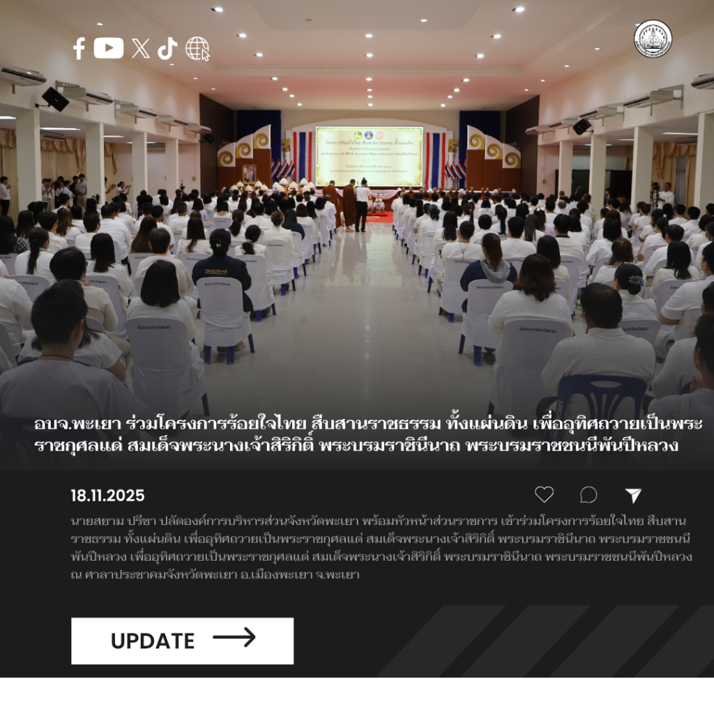 วันที่ 18 พฤศจิกายน 2568 นายธวัช สุทธวงค์ นายกองค์การบริหารส่วนจังหวัดพะเยา มอบหมายให้ นายสยาม ปรีชา ปลัดองค์การบริหารส่วนจังหวัดพะเยา พร้อมหัวหน้าส่วนราชการ เข้าร่วมโครงการร้อยใจไทย สืบสานราชธรรม ทั้งแผ่นดิน เพื่ออุทิศถวายเป็นพระราชกุศลแด่ สมเด็จพระนางเจ้าสิริกิติ์ พระบรมราชินีนาถ พระบรมราชชนนีพันปีหลวง ณ ศาลาประชาคมจังหวัดพะเยา อ.เมืองพะเยา จ.พะเยา