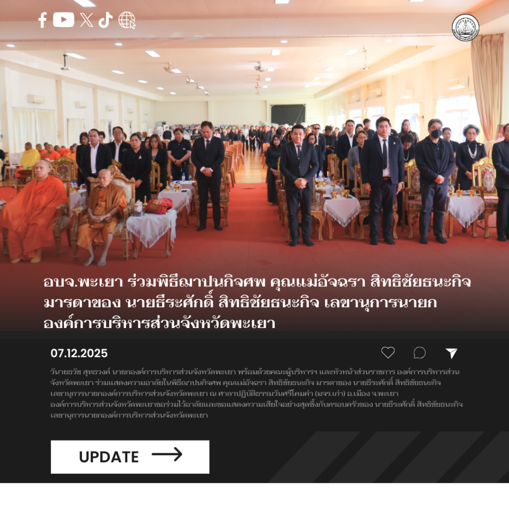 องค์การบริหารส่วนจังหวัดพะเยาขอร่วมไว้อาลัยและขอแสดงความเสียใจอย่างสุดซึ้งกับครอบครัวของ นายธีระศักดิ์ สิทธิชัยธนะกิจ เลขานุการนายกองค์การบริหารส่วนจังหวัดพะเยา