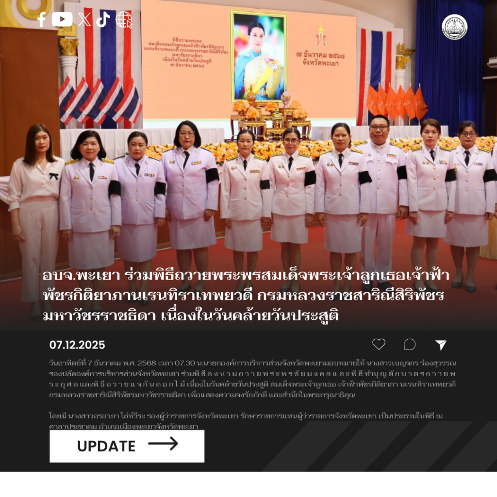 วันอาทิตย์ที่ 7 ธันวาคม พ.ศ. 2568 เวลา 07.30 น.นายธวัช สุทธวงค์ นายกองค์การบริหารส่วนจังหวัดพะเยามอบหมายให้ นางสาวเบญจกร ร่องสุวรรณ รองปลัดองค์การบริหารส่วนจังหวัดพะเยา ร่วมพิ ธี ล ง น า ม ถ ว า ย พ ร ะ พ ร ชั ย ม ง ค ล แ ล ะ พิ ธี ทำบุ ญ ตั ก บ า ต ร ถ ว า ย พ ร ะ กุ ศ ล และพิ ธี ถ ว า ย แ จ กั น ด อ ก ไ ม้ เนื่องในวันคล้ายวันประสูติ สมเด็จพระเจ้าลูกเธอ เจ้าฟ้าพัชรกิติยาภา นเรนทิราเทพยวดี กรมหลวงราชสาริณีสิริพัชรมหาวัชรราชธิดา เพื่อแสดงความจงรักภักดี และสำนึกในพระกรุณาธิคุณ