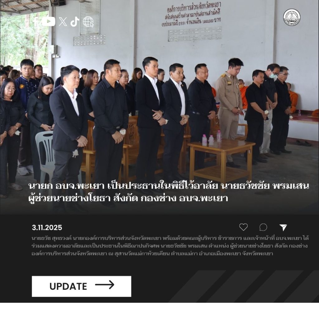 นายก อบจ.พะเยา เป็นประธานในพิธีไว้อาลัย นายธวัชชัย พรมเสน ตำแหน่ง ผู้ช่วยนายช่างโยธา สังกัด กองช่าง องค์การบริหารส่วนจังหวัดพะเยา