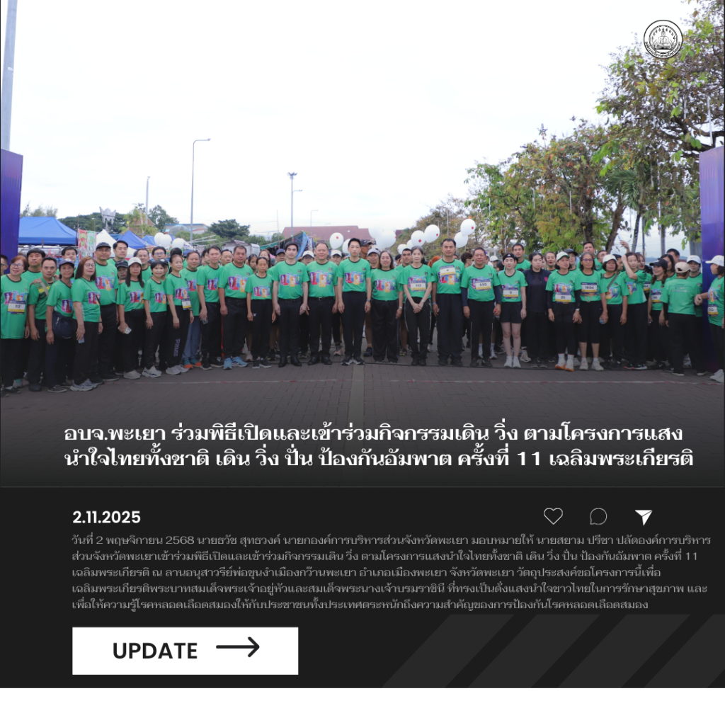 วันที่ 2 พฤษจิกายน 2568 นายธวัช สุทธวงค์ นายกองค์การบริหารส่วนจังหวัดพะเยา มอบหมายให้ นายสยาม ปรีชา ปลัดองค์การบริหารส่วนจังหวัดพะเยาเข้าร่วมพิธีเปิดและเข้าร่วมกิจกรรมเดิน วิ่ง ตามโครงการแสงนำใจไทยทั้งชาติ เดิน วิ่ง ปั่น ป้องกันอัมพาต ครั้งที่ 11 เฉลิมพระเกียรติ ณ ลานอนุสาวรีย์พ่อขุนงำเมืองกว๊านพะเยา อำเภอเมืองพะเยา จังหวัดพะเยา