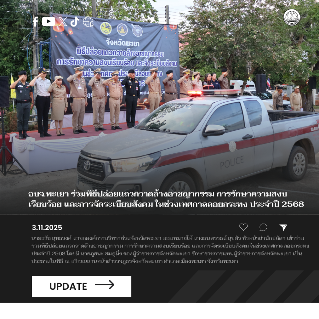 วันที่ 3 พฤศจิกายน 2568 นายธวัช สุทธวงค์ นายกองค์การบริหารส่วนจังหวัดพะเยา มอบหมายให้ นางธนพรรธน์ สุขตัว หัวหน้าสำนักปลัดฯ เข้าร่วมร่วมพิธีปล่อยแถวกวาดล้างอาชญากรรม การรักษาความสงบเรียบร้อย และการจัดระเบียบสังคม ในช่วงเทศกาลลอยกระทง ประจำปี 2568