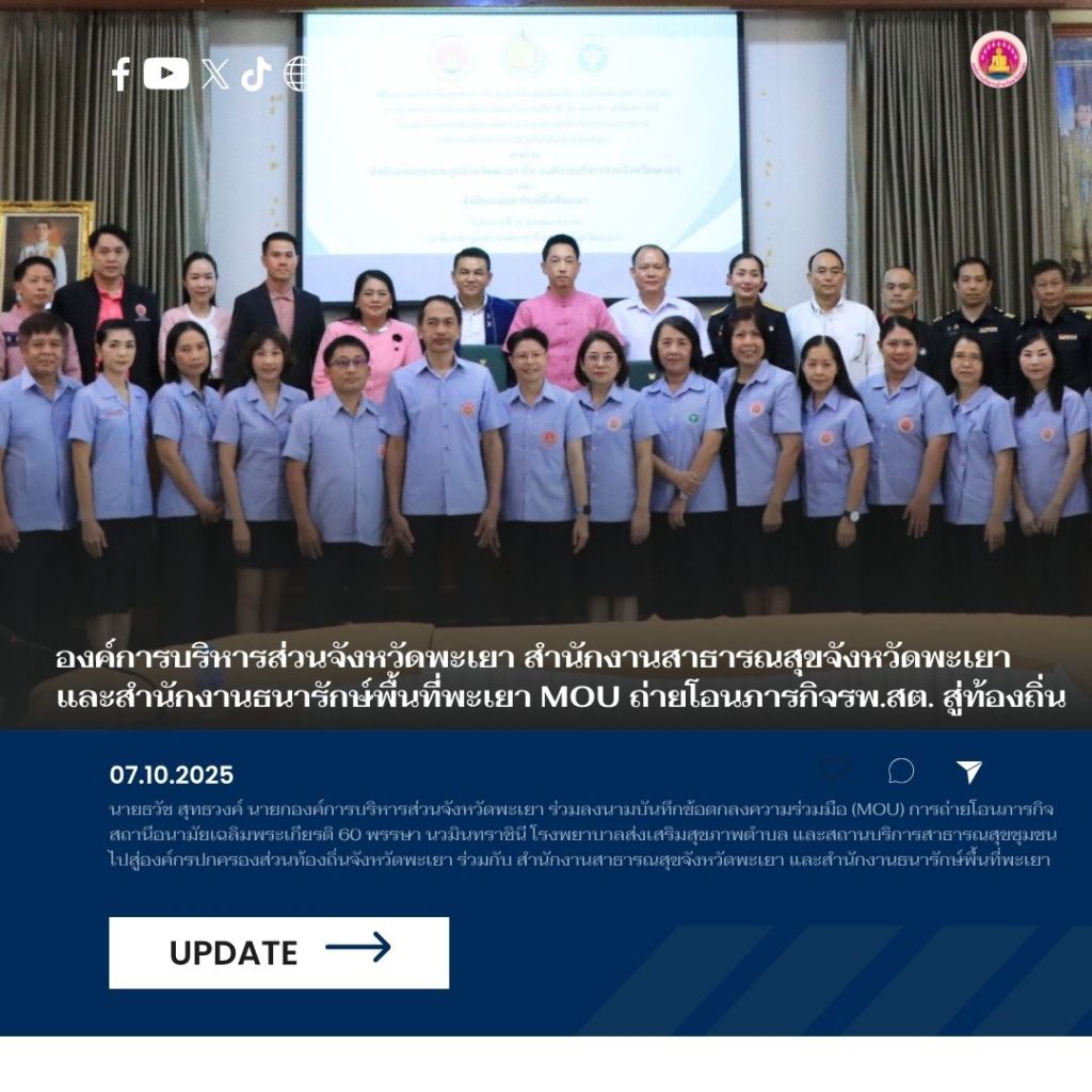 วันที่ 7 ตุลาคม 2568 นายธวัช สุทธวงค์ นายกองค์การบริหารส่วนจังหวัดพะเยา ร่วมลงนามบันทึกข้อตกลงความร่วมมือ (MOU) การถ่ายโอนภารกิจสถานีอนามัยเฉลิมพระเกียรติ 60 พรรษา นวมินทราชินี โรงพยาบาลส่งเสริมสุขภาพตำบล และสถานบริการสาธารณสุขชุมชน ไปสู่องค์กรปกครองส่วนท้องถิ่นจังหวัดพะเยา ร่วมกับ สำนักงานสาธารณสุขจังหวัดพะเยา และสำนักงานธนารักษ์พื้นที่พะเยา โดยมี นายภูธนะ ชมภูมิ่ง รองผู้ว่าราชการจังหวัดพะเยา รักษาราชการแทนผู้ว่าราชการจังหวัดพะเยา เป็นประธานในพิธีฯ ณ ห้องประชุมสภาองค์การบริหารส่วนจังหวัดพะเยา