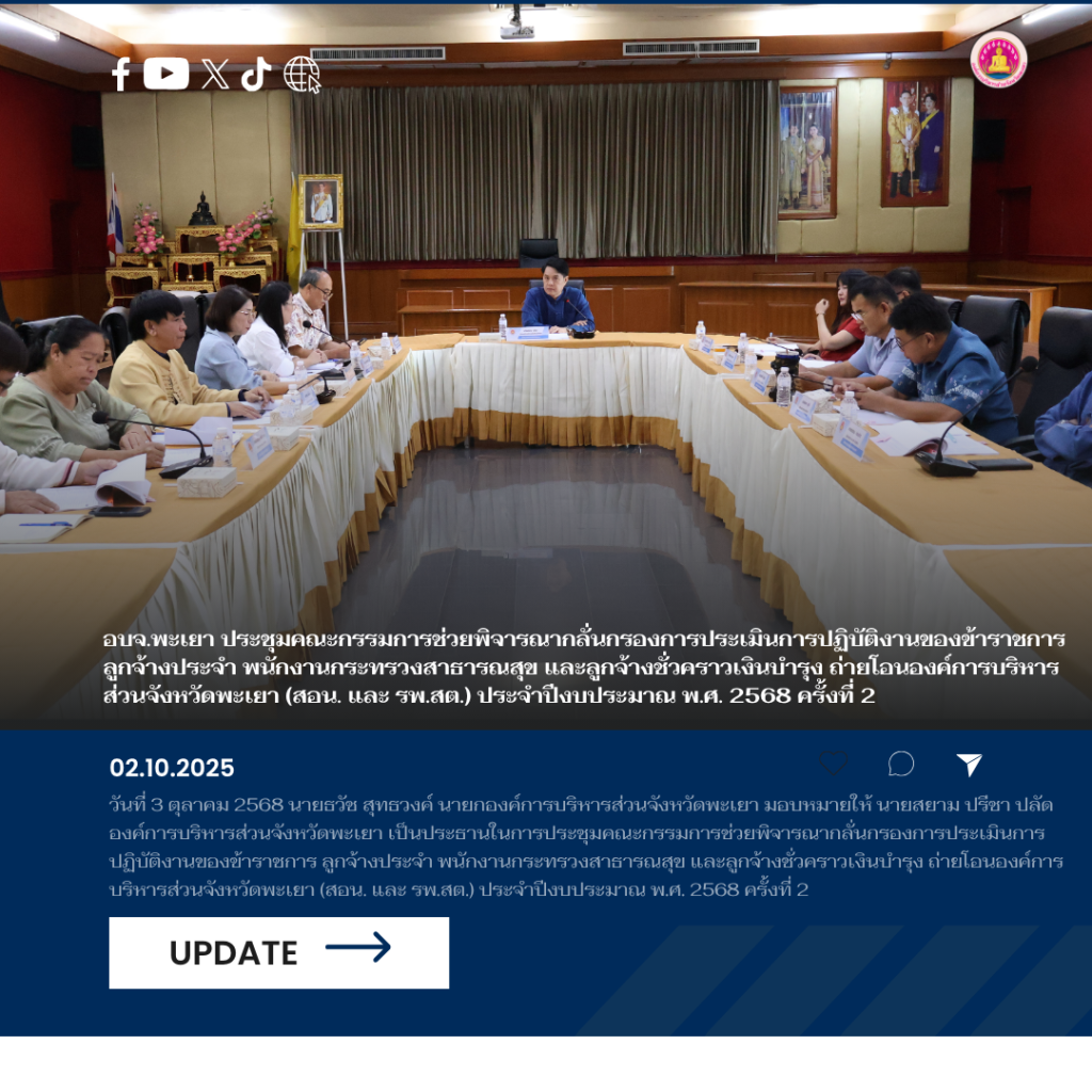 วันที่ 3 ตุลาคม 2568 นายธวัช สุทธวงค์ นายกองค์การบริหารส่วนจังหวัดพะเยา มอบหมายให้ นายสยาม ปรีชา ปลัดองค์การบริหารส่วนจังหวัดพะเยา เป็นประธานในการประชุมคณะกรรมการช่วยพิจารณากลั่นกรองการประเมินการปฏิบัติงานของข้าราชการ ลูกจ้างประจำ พนักงานกระทรวงสาธารณสุข และลูกจ้างชั่วคราวเงินบำรุง ถ่ายโอนองค์การบริหารส่วนจังหวัดพะเยา