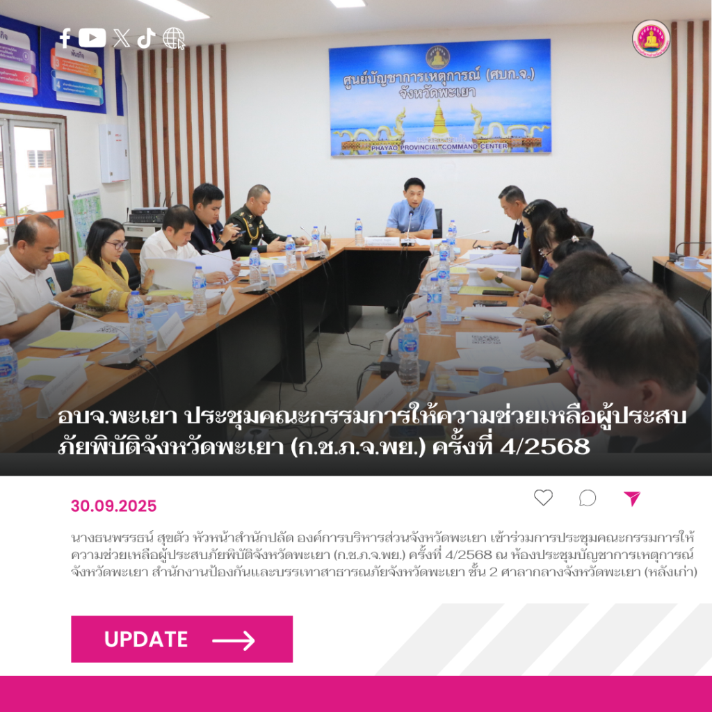 วันที่ 29 กันยายน 2568 นายธวัช สุทธวงค์ นายกองค์การบริหารส่วนจังหวัดพะเยา มอบหมายให้นางธนพรรธน์ สุขตัว หัวหน้าสำนักปลัด องค์การบริหารส่วนจังหวัดพะเยา เข้าร่วมการประชุมคณะกรรมการให้ความช่วยเหลือผู้ประสบภัยพิบัติจังหวัดพะเยา (ก.ช.ภ.จ.พย.) ครั้งที่ 4/2568 ณ ห้องประชุมบัญชาการเหตุการณ์จังหวัดพะเยา สำนักงานป้องกันและบรรเทาสาธารณภัยจังหวัดพะเยา ชั้น 2 ศาลากลางจังหวัดพะเยา (หลังเก่า)