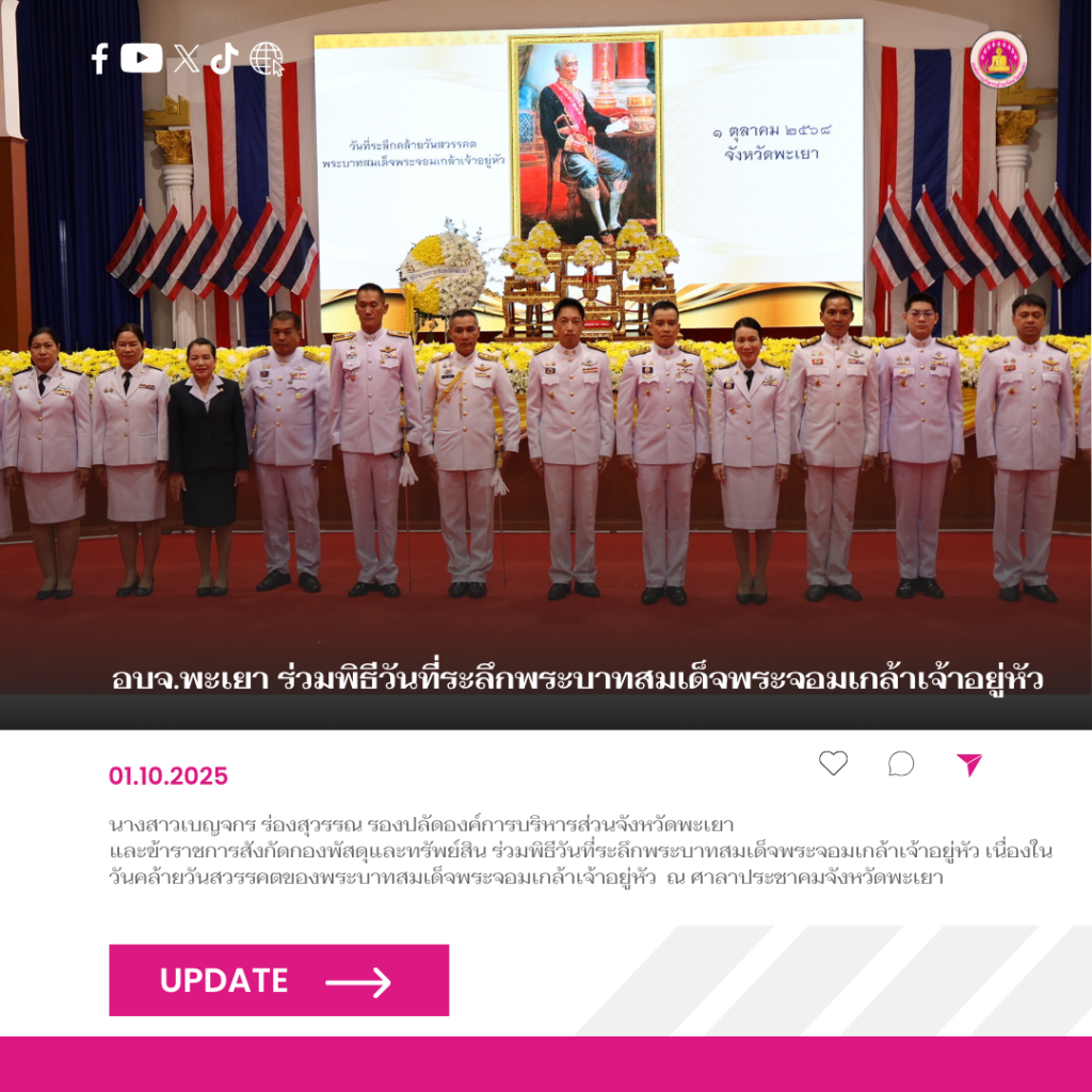 วันที่ 1 ตุลาคม 2568 นายธวัช สุทธวงค์ นายกองค์การบริหารส่วนจังหวัดพะเยา มอบหมายให้นางสาวเบญจกร ร่องสุวรรณ รองปลัดองค์การบริหารส่วนจังหวัดพะเยา