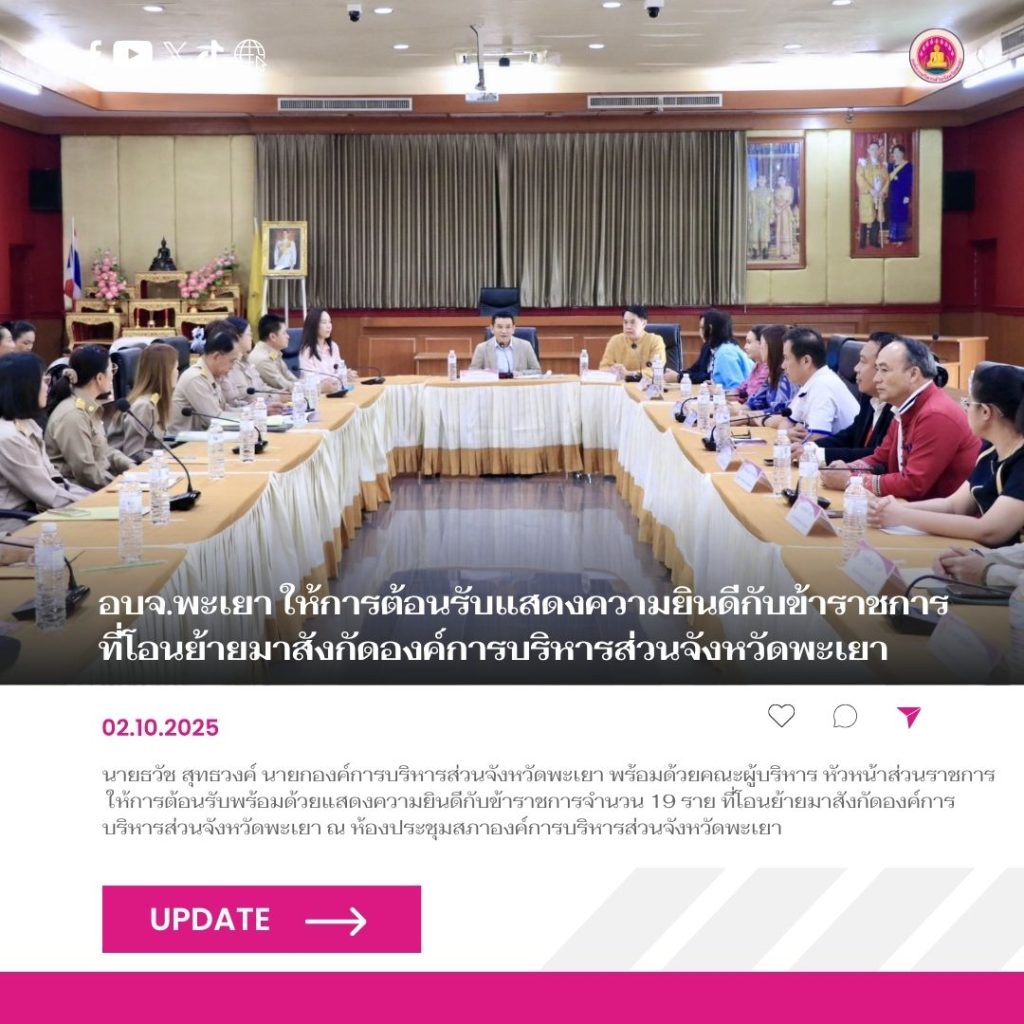 วันที่ 2 ตุลาคม 2568 นายธวัช สุทธวงค์ นายกองค์การบริหารส่วนจังหวัดพะเยา พร้อมด้วยคณะผู้บริหาร หัวหน้าส่วนราชการ ให้การต้อนรับพร้อมด้วยแสดงความยินดีกับข้าราชการจำนวน 19 ราย ที่โอนย้ายมาสังกัดองค์การบริหารส่วนจังหวัดพะเยา โดยมีรายชื่อดังนี้