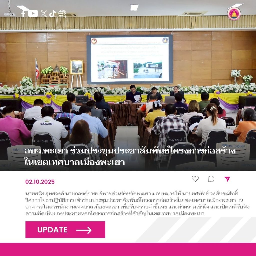 นที่ 2 ตุลาคม 2568 นายธวัช สุทธวงค์ นายกองค์การบริหารส่วนจังหวัดพะเยา มอบหมายให้ นายยศพัทธ์ วงศ์ประสิทธิ์ วิศวกรโยธาปฏิบัติการ เข้าร่วมประชุมประชาสัมพันธ์โครงการก่อสร้างในเขตเทศบาลเมืองพะเยา ณ อาคารสโมสรพนักงานเทศบาลเมืองพะเยา เพื่อรับทราบคำชี้แจง และทำความเข้าใจ และเปิดเวทีรับฟังความคิดเห็นของประชาชนต่อโครงการก่อสร้างที่สำคัญในเขตเทศบาลเมืองพะเยา โดยมี 2 โครงการหลัก ได้แก่