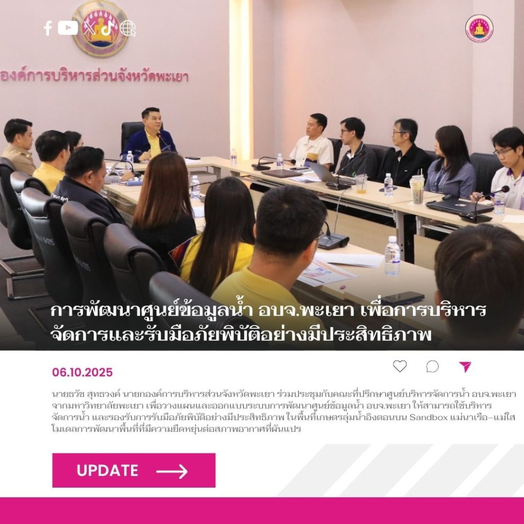 วันที่ 6 ตุลาคม 2568 นายธวัช สุทธวงค์ นายกองค์การบริหารส่วนจังหวัดพะเยา พร้อมด้วยคณะผู้บริหาร ข้าราชการ และเจ้าหน้าที่ที่เกี่ยวข้อง ร่วมประชุมกับคณะที่ปรึกษาศูนย์บริหารจัดการน้ำ อบจ.พะเยา โดยมี รองศาสตราจารย์ ดร.สิทธิชัย พิมลศรี ประธานหลักสูตรปรัชญาดุษฎีบัณฑิต คณะพลังงานและสิ่งแวดล้อม มหาวิทยาลัยพะเยา และ ผู้ช่วยศาสตราจารย์ ดร.นิติ เอี่ยมชื่น ประธานหลักสูตรวิทยาศาสตรมหาบัณฑิต สาขาภูมิสารสนเทศประยุกต์ คณะเทคโนโลยีและการสื่อสาร มหาวิทยาลัยพะเยา ร่วมเป็นที่ปรึกษา การประชุมครั้งนี้มีวัตถุประสงค์เพื่อวางแผนและออกแบบระบบการพัฒนาศูนย์ข้อมูลน้ำ อบจ.พะเยา ให้สามารถใช้เป็นเครื่องมือสำคัญในการบริหารจัดการทรัพยากรน้ำ และรองรับการรับมือภัยพิบัติอย่างมีประสิทธิภาพ ในพื้นที่เกษตรลุ่มน้ำอิงตอนบน Sandbox แม่นาเรือ–แม่ใส โมเดลการพัฒนาพื้นที่ที่มีความยืดหยุ่นต่อสภาพอากาศที่ผันแปร ณ ห้องประชุมชั้น 4 องค์การบริหารส่วนจังหวัดพะเยา เพื่อนำไปสู่แนวทางการพัฒนาศูนย์ข้อมูลน้ำที่สามารถตอบสนองต่อความต้องการของพื้นที่ และเสริมสร้างความพร้อมในการรับมือกับสถานการณ์ภัยพิบัติในอนาคต
