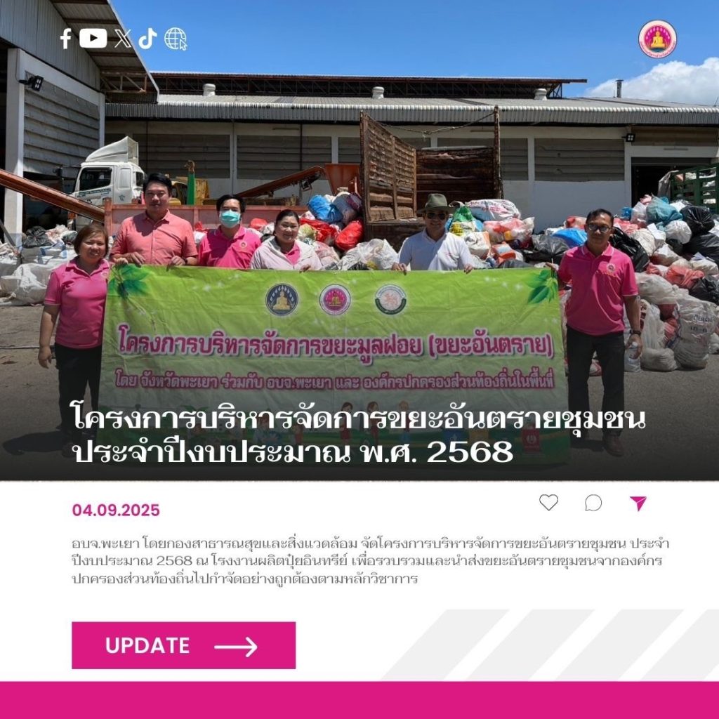 เมื่อวันที่ 4 กันยายน 2568 เวลา 09.00 – 11.00 น. องค์การบริหารส่วนจังหวัดพะเยา โดยกองสาธารณสุขและสิ่งแวดล้อม ดำเนินการจัดโครงการบริหารจัดการขยะอันตรายชุมชน ประจำปีงบประมาณ 2568 ณ โรงงานผลิตปุ๋ยอินทรีย์ องค์การบริหารส่วนจังหวัดพะเยา ตำบลแม่ใส อำเภอเมือง จังหวัดพะเยา เพื่อรวบรวมและนำส่งขยะอันตรายชุมชนจากองค์กรปกครองส่วนท้องถิ่นไปกำจัดอย่างถูกต้องตามหลักวิชาการ ลดผลกระทบต่อสิ่งแวดล้อมและความเสี่ยงต่อสุขภาพของประชาชน โดยมีองค์กรปกครองส่วนท้องถิ่นเข้าร่วมดำเนินการทั้งสิ้น 69 แห่ง