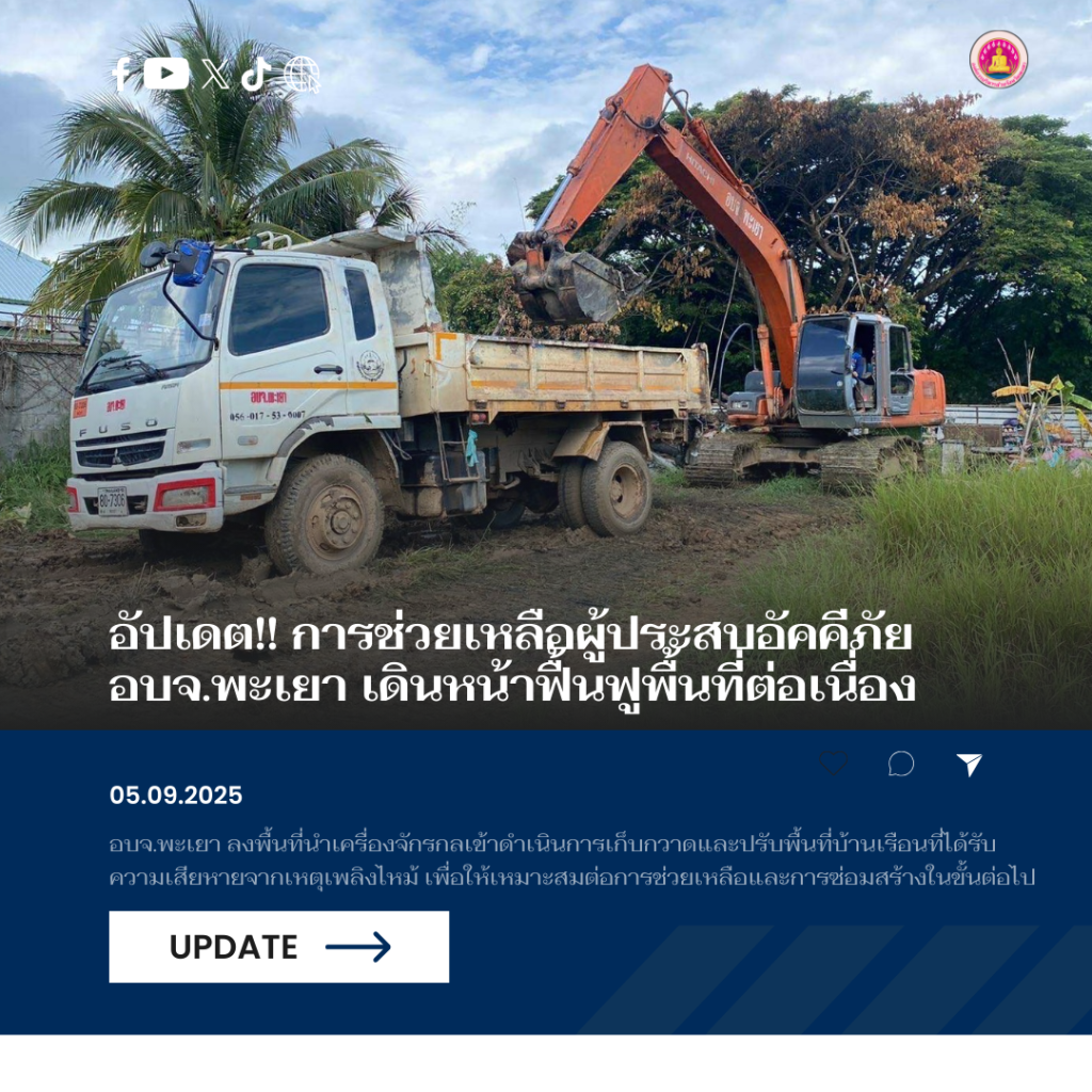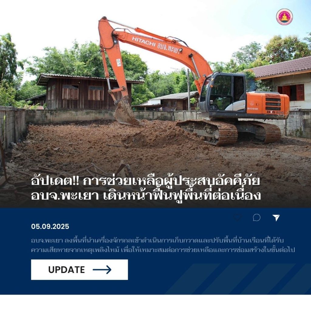 วันที่ 6 กันยายน 2568 ทีมเจ้าหน้าที่กองช่าง และเจ้าหน้าที่บรรเทาสาธารณภัย องค์การบริหารส่วนจังหวัดพะเยา ภายใต้การบริหารงานของนายธวัช สุทธวงค์ นายกองค์การบริหารส่วนจังหวัดพะเยา ได้ลงพื้นที่นำเครื่องจักรกลเข้าดำเนินการเก็บกวาดและปรับพื้นที่บ้านเรือนที่ได้รับความเสียหายจากเหตุเพลิงไหม้ เพื่อจัดการพื้นที่ให้เหมาะสมต่อการช่วยเหลือและการซ่อมสร้างในขั้นต่อไป