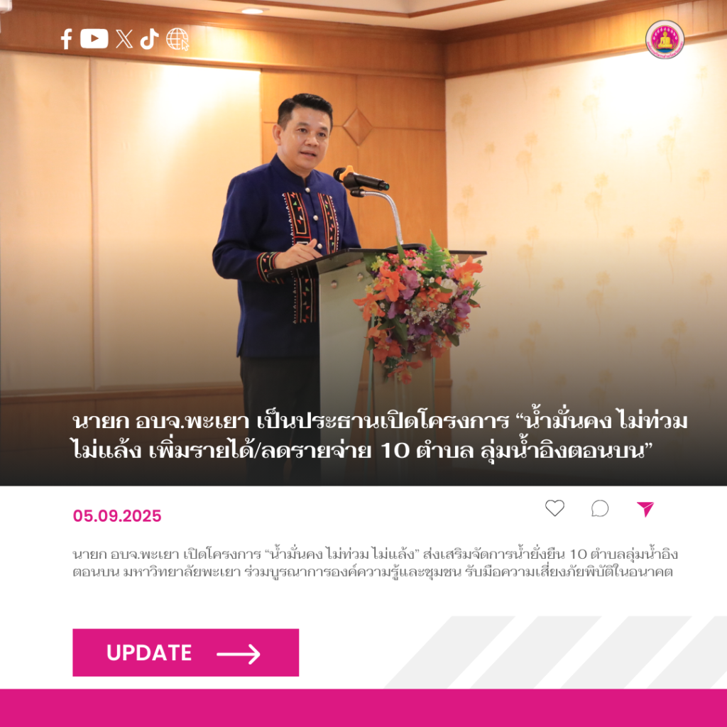 วันที่ 5 กันยายน 2568 นายธวัช สุทธวงค์ นายกองค์การบริหารส่วนจังหวัดพะเยา พร้อมด้วยคณะผู้บริหาร เป็นประธานพิธีเปิดโครงการ“น้ำมั่นคง ไม่ท่วม ไม่แล้ง เพิ่มรายได้/ลดรายจ่าย 10 ตําบลลุ่มน้ำอิงตอนบน” ณ ห้องประชุมภูกลองฮิลล์ ตําบลบ้านตุ่น อําเภอเมืองพะเยาจังหวัดพะเยา