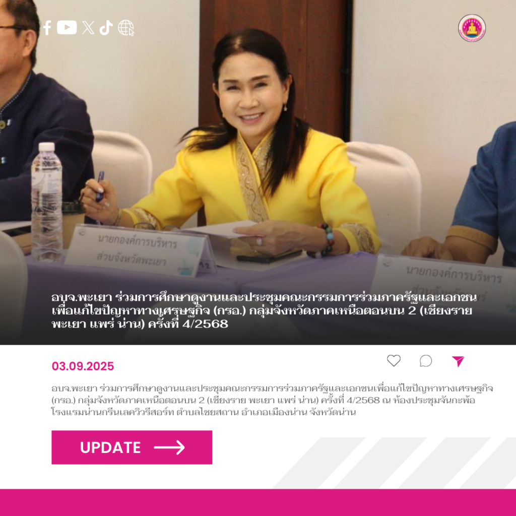 วันที่ 3 กันยายน 2568 นายธวัช สุทธวงค์ นายกองค์การบริหารส่วนจังหวัดพะเยา มอบหมายให้นางธนพรรธน์ สุขตัว หัวหน้าสำนักปลัดองค์การบริหารส่วนจังหวัดพะเยา เข้าร่วมการศึกษาดูงานและประชุมคณะกรรมการร่วมภาครัฐและเอกชนเพื่อแก้ไขปัญหาทางเศรษฐกิจ (กรอ.) กลุ่มจังหวัดภาคเหนือตอนบน 2 (เชียงราย พะเยา แพร่ น่าน) ครั้งที่ 4/2568 ณ ห้องประชุมจันกะพ้อ โรงแรมน่านกรีนเลควิวรีสอร์ท ตำบลไชยสถาน อำเภอเมืองน่าน จังหวัดน่าน