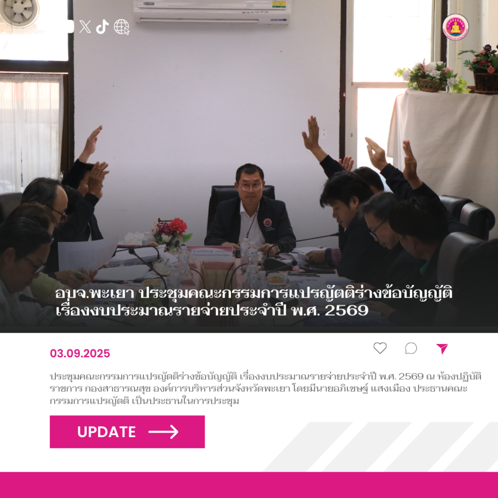 วันที่ 3 กันยายน 2568 องค์การบริหารส่วนจังหวัดพะเยา จัดประชุมคณะกรรมการแปรญัตติร่างข้อบัญญัติ เรื่องงบประมาณรายจ่ายประจำปี พ.ศ. 2569 ณ ห้องปฏิบัติราชการ กองสาธารณสุข องค์การบริหารส่วนจังหวัดพะเยา โดยมีนายอภิเชษฐ์ แสงเมือง ประธานคณะกรรมการแปรญัตติ เป็นประธานในการประชุม
