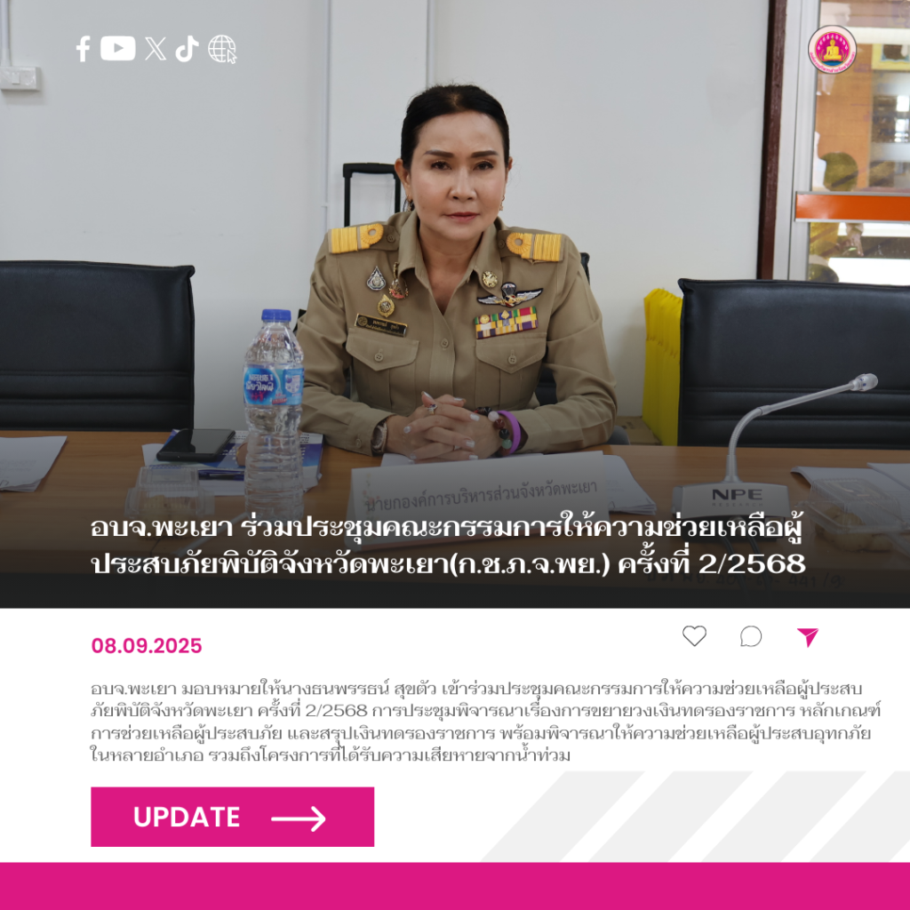 วันที่8 กันยายน 2568 นายธวัช สุทธวงค์ นายกองค์การบริหารส่วนจังหวัดพะเยา มอบหมายให้นางธนพรรธน์ สุขตัว หัวหน้าสำนักปลัดองค์การบริหารส่วนจังหวัดพะเยา เข้าร่วมประชุมคณะกรรมการให้ความช่วยเหลือผู้ประสบภัยพิบัติจังหวัดพะเยา(ก.ช.ภ.จ.พย.) ครั้งที่ 2/2568 ณ ห้องประชุมศูนย์บัญชาการเหตุการณ์จังหวัดพะเยาสํานักงานป้องกันและบรรเทาสาธารณภัย จังหวัดพะเยา ชั้น 2 ศาลากลางจังหวัดพะเยา(หลังเก่า) การประชุมในครั้งนี้เพื่อพิจารณาตามระเบียบวาระการประชุม ดังต่อไปนี้