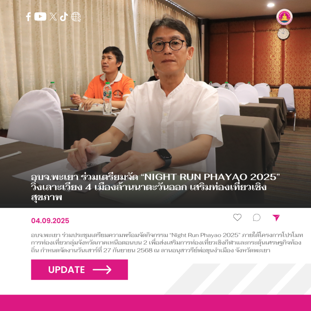 วันที่ 4 กันยายน 2568 นายธวัช สุทธวงค์ นายกองค์การบริหารส่วนจังหวัดพะเยา มอบหมายให้นายวัชรินทร์ ใจเพลิน นักจัดการงานทั่วไปชำนาญการ รักษาการในตำแหน่งหัวหน้าฝ่ายส่งเสริมกีฬาและนันทนาการ เข้าร่วมประชุมเตรียมความพร้อมการดำเนินโครงการโปรโมทการท่องเที่ยวกลุ่มจังหวัดภาคเหนือตอนบน 2 กิจกรรมหลัก “การจัดงานโปรโมทการท่องเที่ยวเชิงสุขภาพ” กิจกรรมย่อยที่ 1 “วิ่งเลาะเวียง 4 เมืองล้านนาตะวันออก” และกิจกรรม “Night Run Phayao 2025” ณ ห้องประชุมพรมาลี โรงแรมพะเยาเกทเวย์ อำเภอเมืองพะเยา จังหวัดพะเยา โดยมีนายภาณุพันธ์ เอี่ยมอุบลวรรณ ท่องเที่ยวและกีฬาจังหวัดพะเยา พร้อมด้วยเจ้าหน้าที่สำนักงานการท่องเที่ยวและกีฬาจังหวัดพะเยา และนางสาวอัจรี พันธุ์ศรี ผู้แทนจากบริษัท ฟอร์เวิร์ด สตูดิโอ จำกัด ซึ่งเป็นผู้รับผิดชอบการออกแบบและกำหนดรูปแบบการจัดกิจกรรมครั้งนี้ เข้าร่วมประชุมเพื่อร่วมวางแผนและกำหนดทิศทางการดำเนินงาน