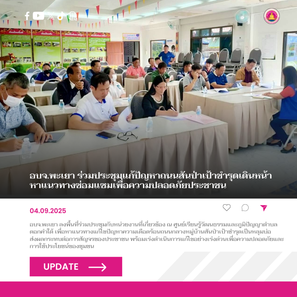ทั้งนี้ ถนนสายดังกล่าวอยู่ในสภาพชำรุดทรุดโทรม เป็นหลุมเป็นบ่อขนาดใหญ่ ส่งผลกระทบต่อการสัญจรและความปลอดภัยของประชาชนในพื้นที่ การประชุมครั้งนี้จัดขึ้น ณ ศูนย์เรียนรู้วัฒนธรรมและภูมิปัญญาตำบลดอกคำใต้ เพื่อร่วมกันระดมความคิดเห็นและหาแนวทางแก้ไขปัญหาอย่างเร่งด่วนและยั่งยืน องค์การบริหารส่วนจังหวัดพะเยาให้ความสำคัญต่อการแก้ไขปัญหาความเดือดร้อนของประชาชน และพร้อมบูรณาการร่วมกับหน่วยงานที่เกี่ยวข้อง เพื่อให้สามารถดำเนินการแก้ไขปรับปรุงถนนสายดังกล่าวให้กลับมาใช้งานได้อย่างสะดวกและปลอดภัยในเร็ววัน