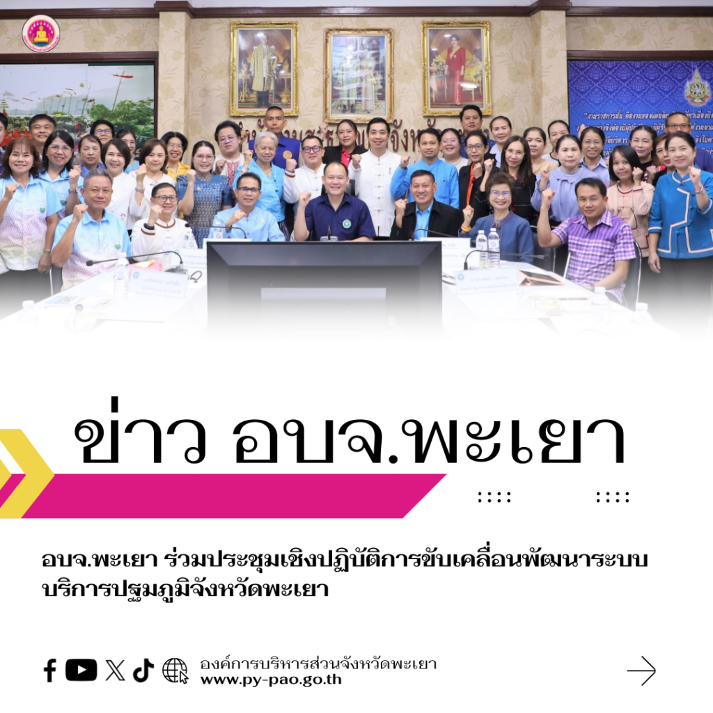 วันที่ 22 สิงหาคม 2568 นายธวัช สุทธวงค์ นายกองค์การบริหารส่วนจังหวัดพะเยา มอบหมายให้ นางแสงทวน แก้วจิโน นักวิชาการสาธารณสุขชำนาญการ เข้าร่วมประชุมเชิงปฏิบัติการขับเคลื่อนพัฒนาระบบบริการปฐมภูมิ จังหวัดพะเยา ประจำปีงบประมาณ 2568 และประกวดคัดเลือกผลงานดีเด่น (Best Practices รพช.แม่ข่าย+รพ.สต.+พชอ. ปีงบประมาณ 2568) ณ ห้องประชุม 1 สำนักงานสาธารณสุขจังหวัดพะเยา