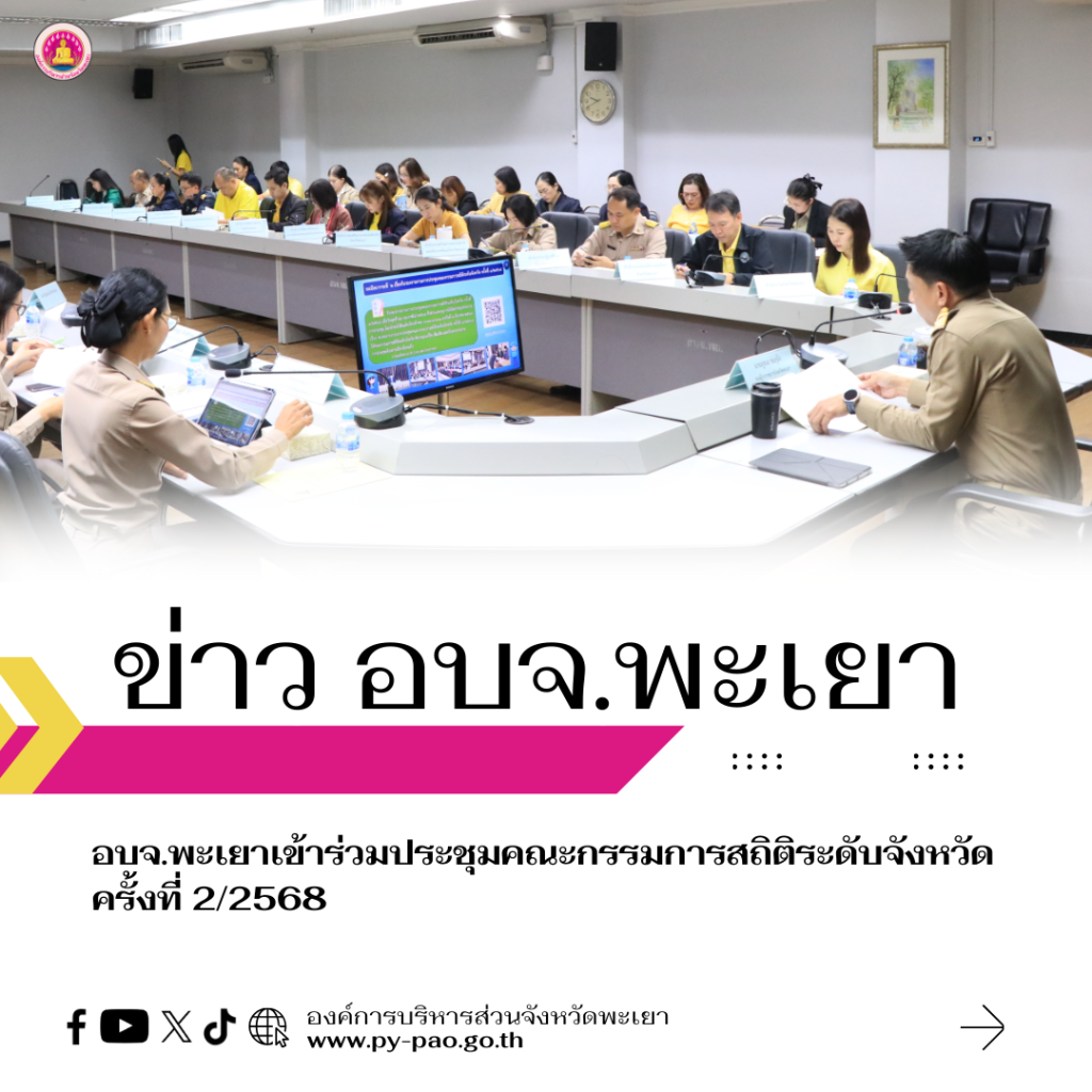วันที่ 25 สิงหาคม 2568 นายธวัชสุทธวงค์ นายกองค์การบริหารส่วนจังหวัดพะเยา มอบหมายให้ นางสาวสุนารี ยาละ ผู้อำนวยการกองยุทธศาสตร์และงบประมาณเข้าร่วมประชุมคณะกรรมการสถิติระดับจังหวัด ครั้งที่ 2/2568 ณ ห้องประชุมจอมทองชั้น 4 ศาลากลางจังหวัดพะเยา โดยมีนายภูธนะ ชมภูมิ่ง รองผู้ว่าราชการจังหวัดพะเยา เป็นประธาน