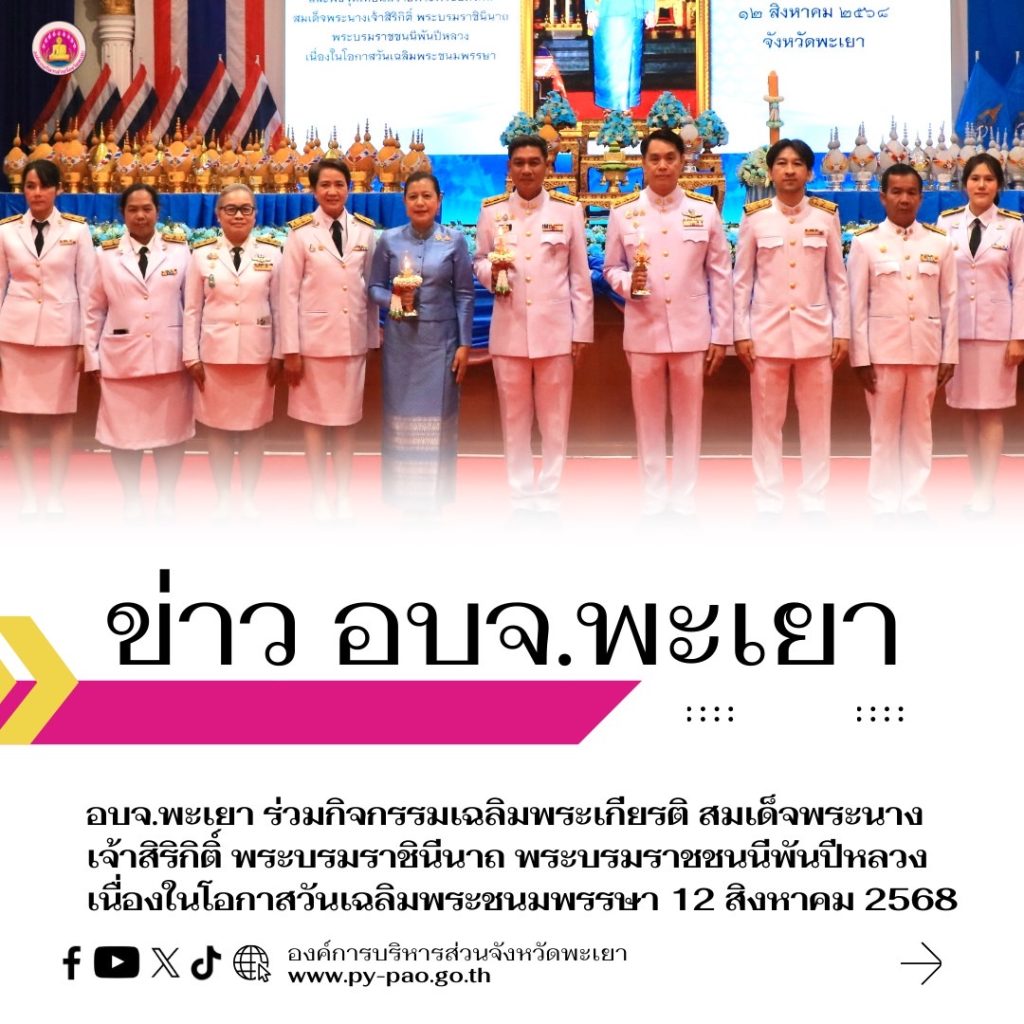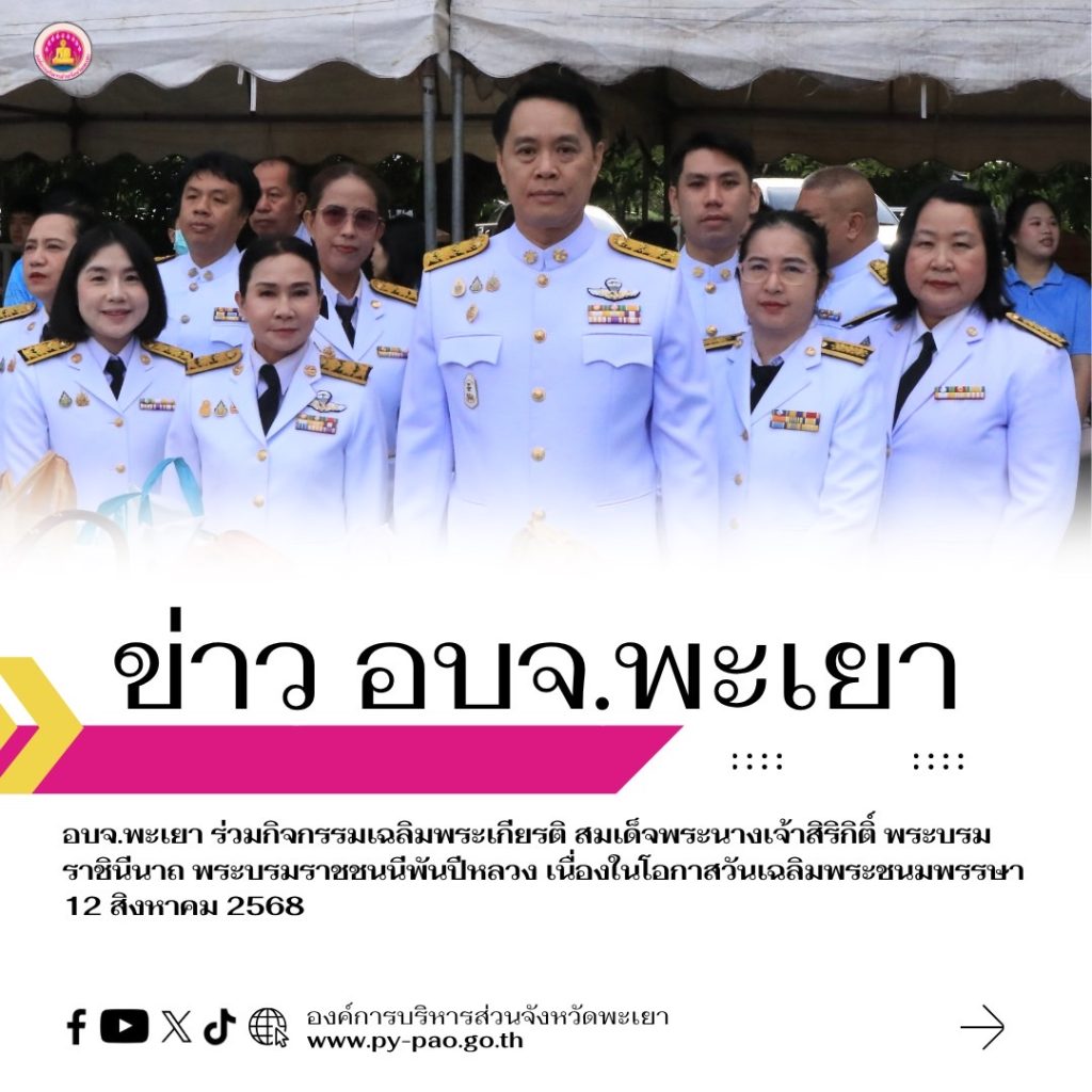 วันที่ 12 สิงหาคม 2568 นายธวัช สุทธวงค์ นายกองค์การบริหารส่วนจังหวัดพะเยา มอบหมายให้ นายสยาม ปรีชา ปลัดองค์การบริหารส่วนจังหวัดพะเยา ปฏิบัติหน้าที่นายกองค์การบริหารส่วนจังหวัดพะเยา พร้อมด้วย ข้าราชการ และเจ้าหน้าที่ องค์การบริหารส่วนจังหวัดพะเยา ร่วมพิธีถวายราชสักการะและวางพานพุ่มและพิธีถวายพระพรชัยมงคล ในกิจกรรมเฉลิมพระเกียรติ สมเด็จพระนางเจ้าสิริกิติ์ พระบรมราชินีนาถ พระบรมราชชนนีพันปีหลวง เนื่องในโอกาสวันเฉลิมพระชนมพรรษา 12 สิงหาคม 2568 โดยมีนายรัฐพล นราดิศร ผู้ว่าราชการจังหวัดพะเยา เป็นประธานในพิธีฯ ณ ศาลาประชาคม