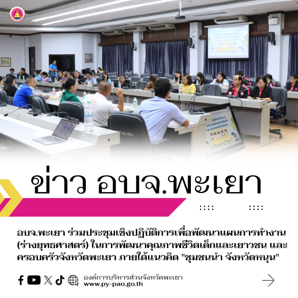วันที่ 13 สิงหาคม 2568 นายธวัช สุทธวงค์ นายกองค์การบริหารส่วนจังหวัดพะเยา มอบหมายให้ อรทัย ศรีศิลป์ หัวหน้าฝ่ายส่งเสริมสุขภาพ ร่วมประชุมเชิงปฏิบัติการเพื่อพัฒนาแผนการทำงาน (ร่างยุทธศาสตร์) ในการพัฒนาคุณภาพชีวิตเด็กและเยาวชน และครอบครัวจังหวัดพะเยา ภายใต้แนวคิด “ชุมชนนำ จังหวัดหนุน” ณ ห้องประชุมภูกามยาว ชั้น 5 ศาลากลางจังหวัดพะเยา เพื่อขยายแนวคิดการพัฒนาสุขภาวะเด็ก เยาวชน และครอบครัว ในพื้นที่หรือหน่วยงานที่สนใจได้ร่วมแลกเปลี่ยนเรียนรู้กับกลุ่มเป้าหมาย ซึ่งประกอบด้วย หน่วยงานราชการ ภาคประชาสังคม และภาคีเครือข่ายและหน่วยงานที่เกี่ยวข้องกับการทำงานด้านเด็ก เยาวชนและครอบครัว