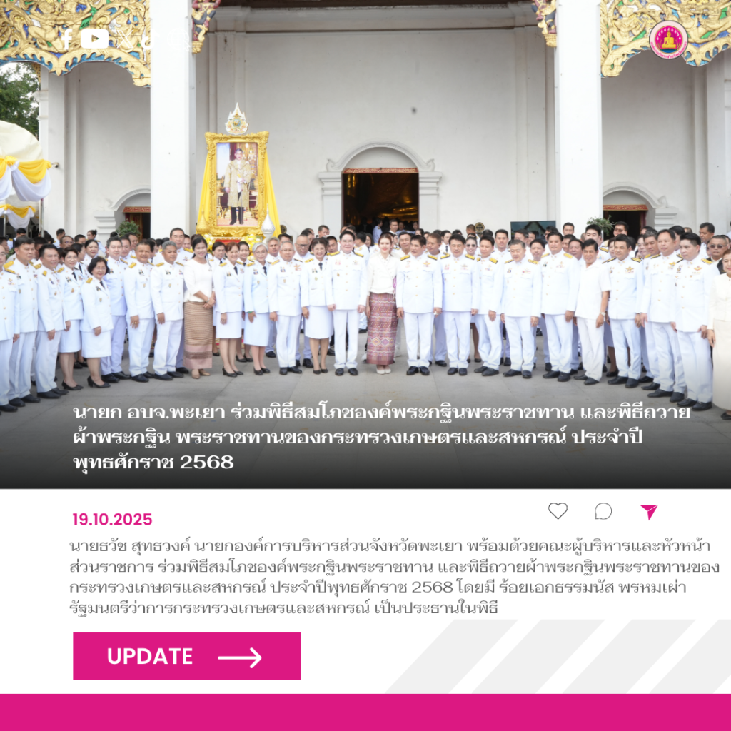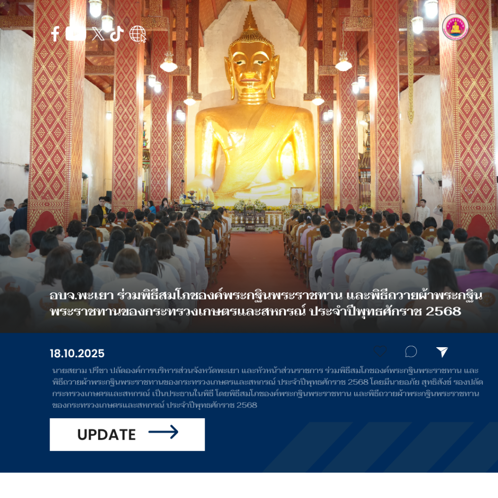 เมื่อวันที่ 18 ตุลาคม 2568 นายธวัช สุทธวงค์ นายกองค์การบริหารส่วนจังหวัดพะเยา มอบหมายให้ นายสยาม ปรีชา ปลัดองค์การบริหารส่วนจังหวัดพะเยา และหัวหน้าส่วนราชการ ร่วมพิธีสมโภชองค์พระกฐินพระราชทาน และพิธีถวายผ้าพระกฐินพระราชทานของกระทรวงเกษตรและสหกรณ์ ประจำปีพุทธศักราช 2568 โดยมีนายอภัย สุทธิสังข์ รองปลัดกระทรวงเกษตรและสหกรณ์ เป็นประธานในพิธี โดยพิธีสมโภชองค์พระกฐินพระราชทาน และพิธีถวายผ้าพระกฐินพระราชทานของกระทรวงเกษตรและสหกรณ์ ประจำปีพุทธศักราช 2568 มีกำหนดการเริ่มพิธีสมโภชเวลา 18.00 น. เสร็จพิธีเวลา 19.00 น. และมีการแสดงส่งท้าย 3การแสดง โดยการจัดพิธีสมโภชองค์พระกฐินพระราชทาน และพิธีถวายผ้าพระกฐินพระราชทานของกระทรวงเกษตรและสหกรณ์ ในครั้งนี้เพื่อน้อมนำผ้าพระกฐินที่กระทรวงเกษตรและสหกรณ์ได้รับพระราชทานไปทอดถวายยังชุมชนสงฆ์ ณ วัดศรีโคมคำ พระอารามหลวง อำเภอเมืองพะเยา จังหวัดพะเยา