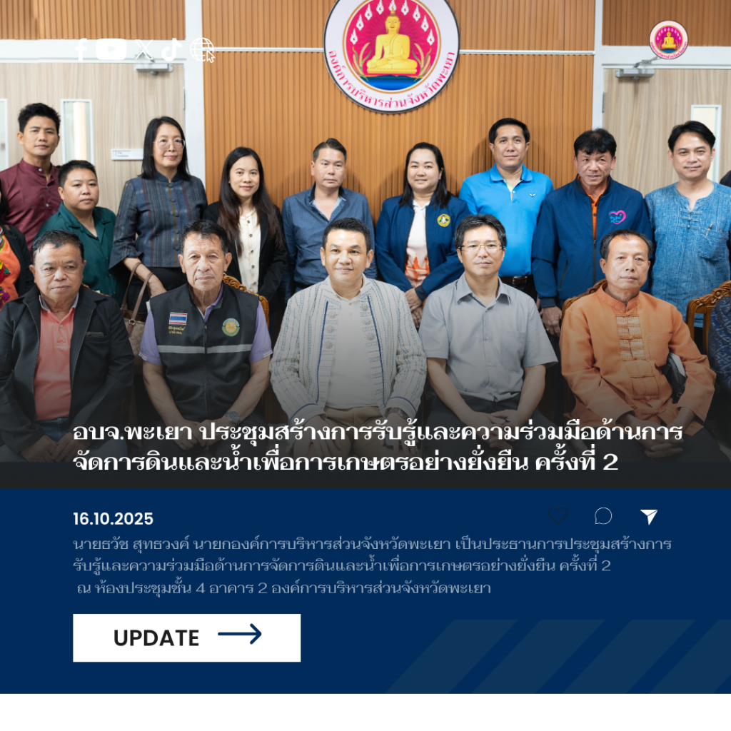 วันที่ 16 ตุลาคม 2568 นายธวัช สุทธวงค์ นายกองค์การบริหารส่วนจังหวัดพะเยา เป็นประธานการประชุมสร้างการรับรู้และความร่วมมือด้านการจัดการดินและน้ำเพื่อการเกษตรอย่างยั่งยืน ครั้งที่ 2 ณ ห้องประชุมชั้น 4 อาคาร 2 องค์การบริหารส่วนจังหวัดพะเยา