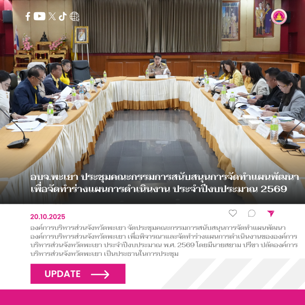 วันที่ 20 ตุลาคม 2568 องค์การบริหารส่วนจังหวัดพะเยา จัดประชุมคณะกรรมการสนับสนุนการจัดทำแผนพัฒนาองค์การบริหารส่วนจังหวัดพะเยา เพื่อพิจารณาและจัดทำร่างแผนการดำเนินงานขององค์การบริหารส่วนจังหวัดพะเยา ประจำปีงบประมาณ พ.ศ. 2569 โดยมีนายสยาม ปรีชา ปลัดองค์การบริหารส่วนจังหวัดพะเยา เป็นประธานในการประชุม ณ ห้องประชุมสภาองค์การบริหารส่วนจังหวัดพะเยา