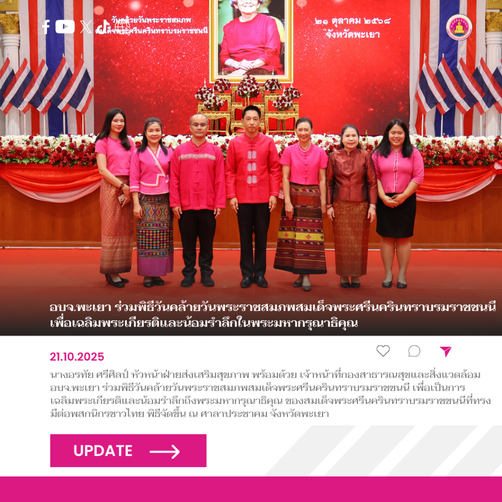 วันที่ 21 ตุลาคม 2568 นายธวัช สุทธวงค์ นายกองค์การบริหารส่วนจังหวัดพะเยา มอบหมายให้ นางอรทัย ศรีศิลป์ หัวหน้าฝ่ายส่งเสริมสุขภาพ พร้อมด้วย เจ้าหน้าที่กองสาธารณสุขและสิ่งแวดล้อม อบจ.พะเยา