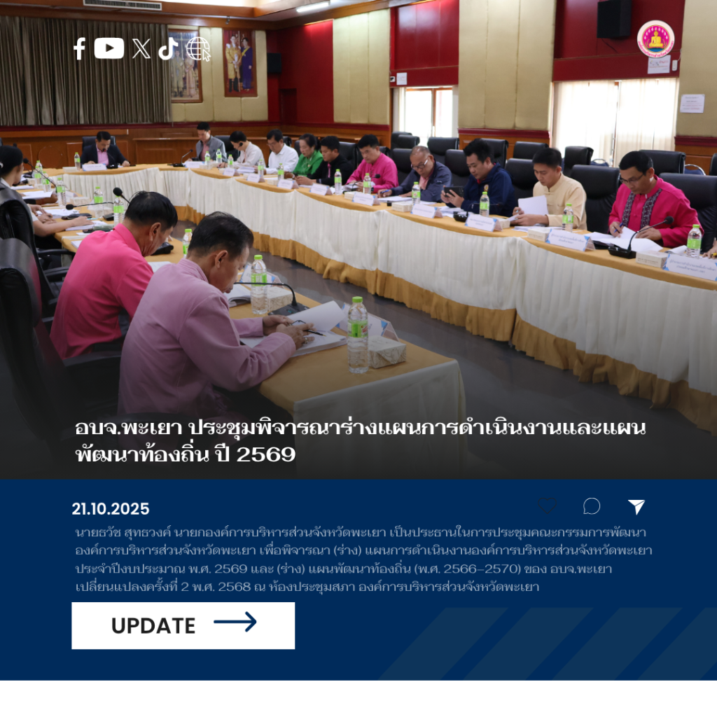 วันที่ 21 ตุลาคม 2568 นายธวัช สุทธวงค์ นายกองค์การบริหารส่วนจังหวัดพะเยา เป็นประธานในการประชุมคณะกรรมการพัฒนาองค์การบริหารส่วนจังหวัดพะเยา เพื่อพิจารณา (ร่าง) แผนการดำเนินงานองค์การบริหารส่วนจังหวัดพะเยา ประจำปีงบประมาณ พ.ศ. 2569 และ (ร่าง) แผนพัฒนาท้องถิ่น (พ.ศ. 2566–2570) ของ อบจ.พะเยา เปลี่ยนแปลงครั้งที่ 2 พ.ศ. 2568 ณ ห้องประชุมสภา องค์การบริหารส่วนจังหวัดพะเยา