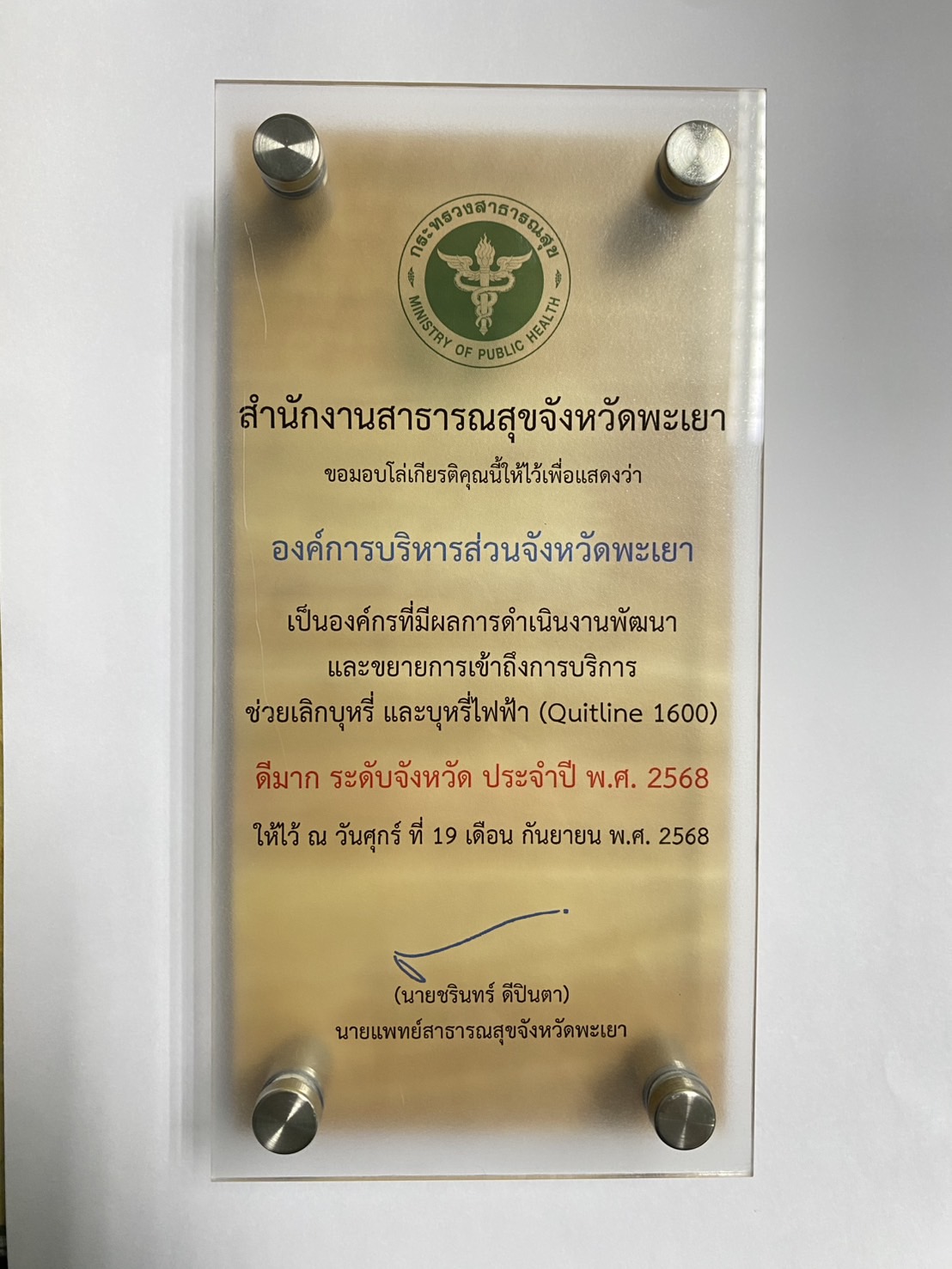 วันที่ 19 กันยายน 2568 นายธวัช สุทธวงค์ นายกองค์การบริหารส่วนจังหวัดพะเยา มอบหมายให้นายสยาม ปรีชา ปลัดองค์การบริหารส่วนจังหวัดพะเยา พร้อมด้วยข้าราชการและเจ้าหน้าที่กองสาธารณสุขและสิ่งแวดล้อม อบจ.พะเยา เข้ารับโล่ประกาศเกียรติคุณ “องค์กรที่ดำเนินงานพัฒนาและขยายการเข้าถึงบริการช่วยเลิกบุหรี่และบุหรี่ไฟฟ้า (Quitline 1600)” ประจำปี พ.ศ. 2568 ณ ห้องประชุมสำนักงานสาธารณสุขจังหวัดพะเยา