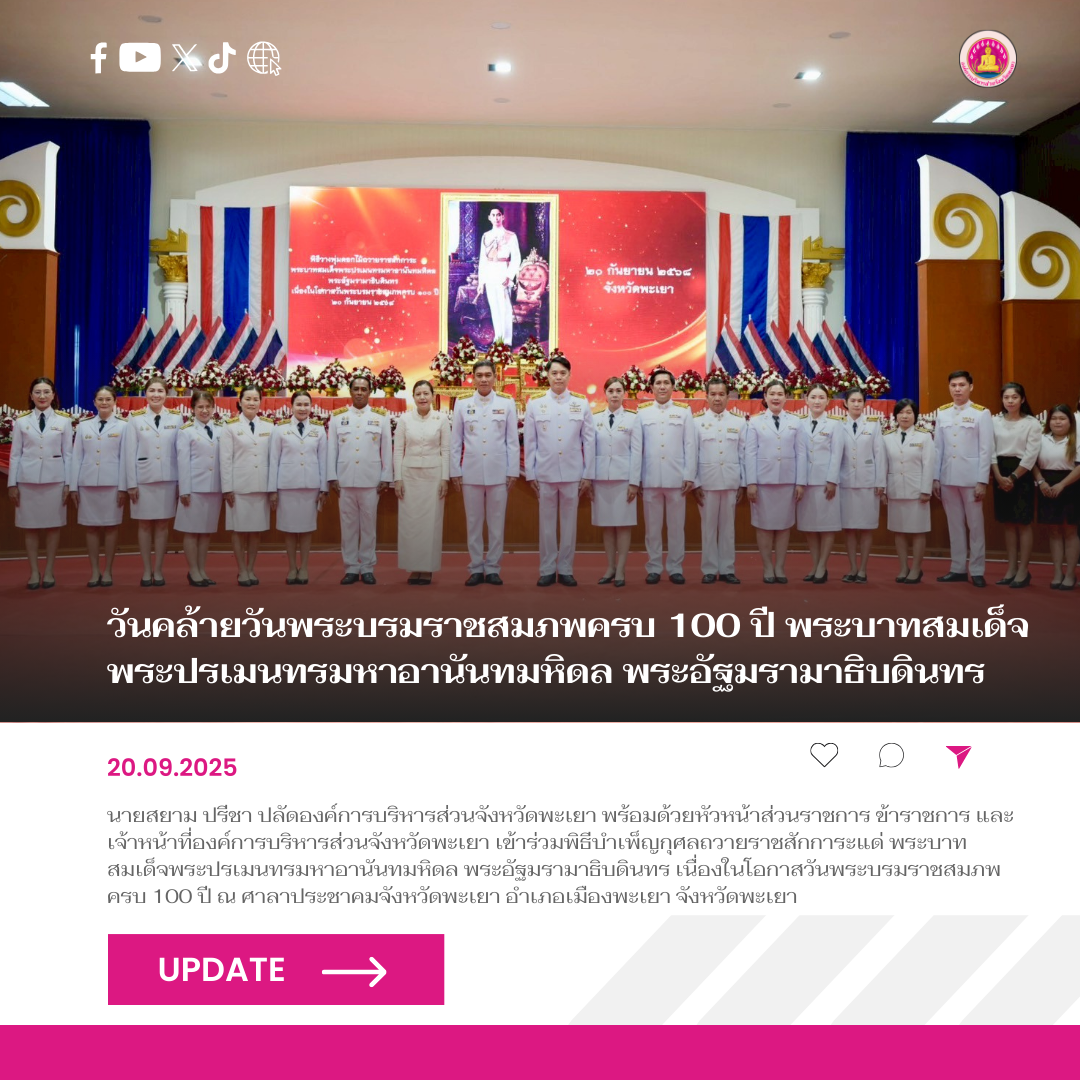 วันที่ 20 กันยายน 2568 นายธวัช สุทธวงค์ นายกองค์การบริหารส่วนจังหวัดพะเยา มอบหมายให้นายสยาม ปรีชา ปลัดองค์การบริหารส่วนจังหวัดพะเยา พร้อมด้วยหัวหน้าส่วนราชการ ข้าราชการ และเจ้าหน้าที่องค์การบริหารส่วนจังหวัดพะเยา เข้าร่วมพิธีบำเพ็ญกุศลถวายราชสักการะแด่ พระบาทสมเด็จพระปรเมนทรมหาอานันทมหิดล พระอัฐมรามาธิบดินทร เนื่องในโอกาสวันพระบรมราชสมภพครบ 100 ปี