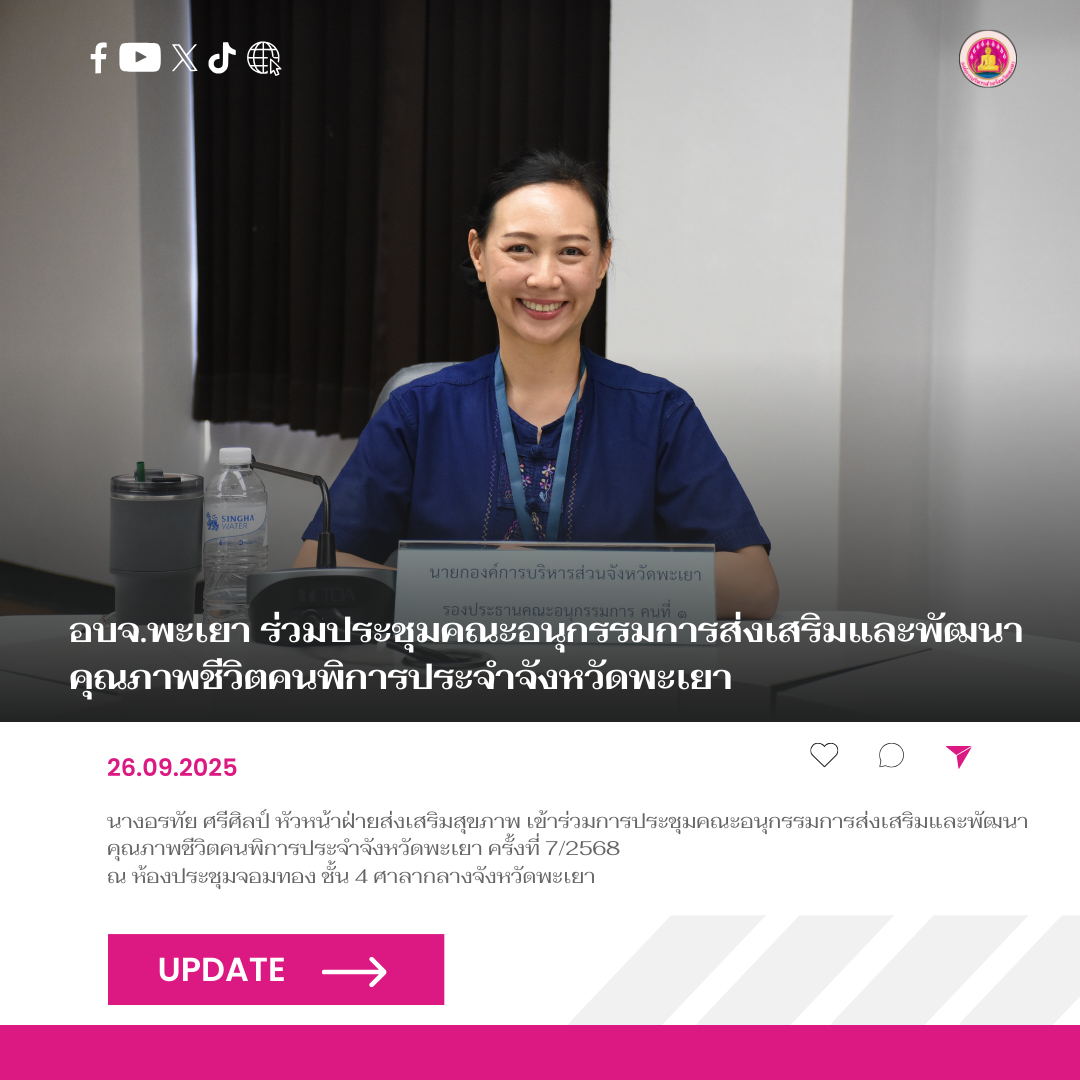 วันที่ 26 กันยายน 2568 องค์การบริหารส่วนจังหวัดพะเยา โดยนายธวัช สุทธวงค์ นายกองค์การบริหารส่วนจังหวัดพะเยา มอบหมายให้ นางอรทัย ศรีศิลป์ หัวหน้าฝ่ายส่งเสริมสุขภาพ เข้าร่วมการประชุมคณะอนุกรรมการส่งเสริมและพัฒนาคุณภาพชีวิตคนพิการประจำจังหวัดพะเยา ครั้งที่ 7/2568
