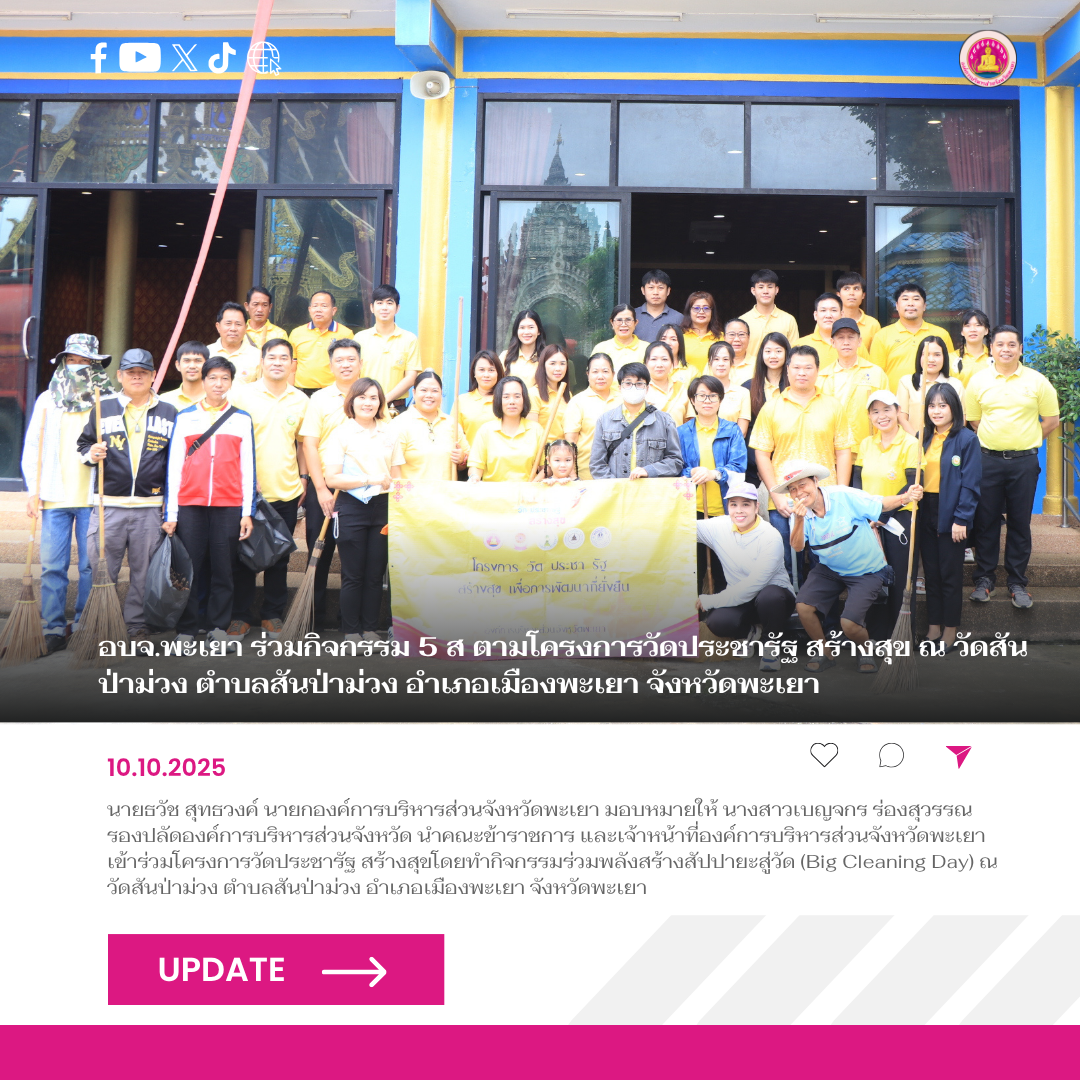 วันที่ 10 ตุลาคม 2568 นายธวัช สุทธวงค์ นายกองค์การบริหารส่วนจังหวัดพะเยา มอบหมายให้ นางสาวเบญจกร ร่องสุวรรณ รองปลัดองค์การบริหารส่วนจังหวัด นำคณะข้าราชการ และเจ้าหน้าที่องค์การบริหารส่วนจังหวัดพะเยา เข้าร่วมโครงการวัดประชารัฐ สร้างสุขโดยทำกิจกรรมร่วมพลังสร้างสัปปายะสู่วัด (Big Cleaning Day) ณ วัดสันป่าม่วง ตำบลสันป่าม่วง อำเภอเมืองพะเยา จังหวัดพะเยา
