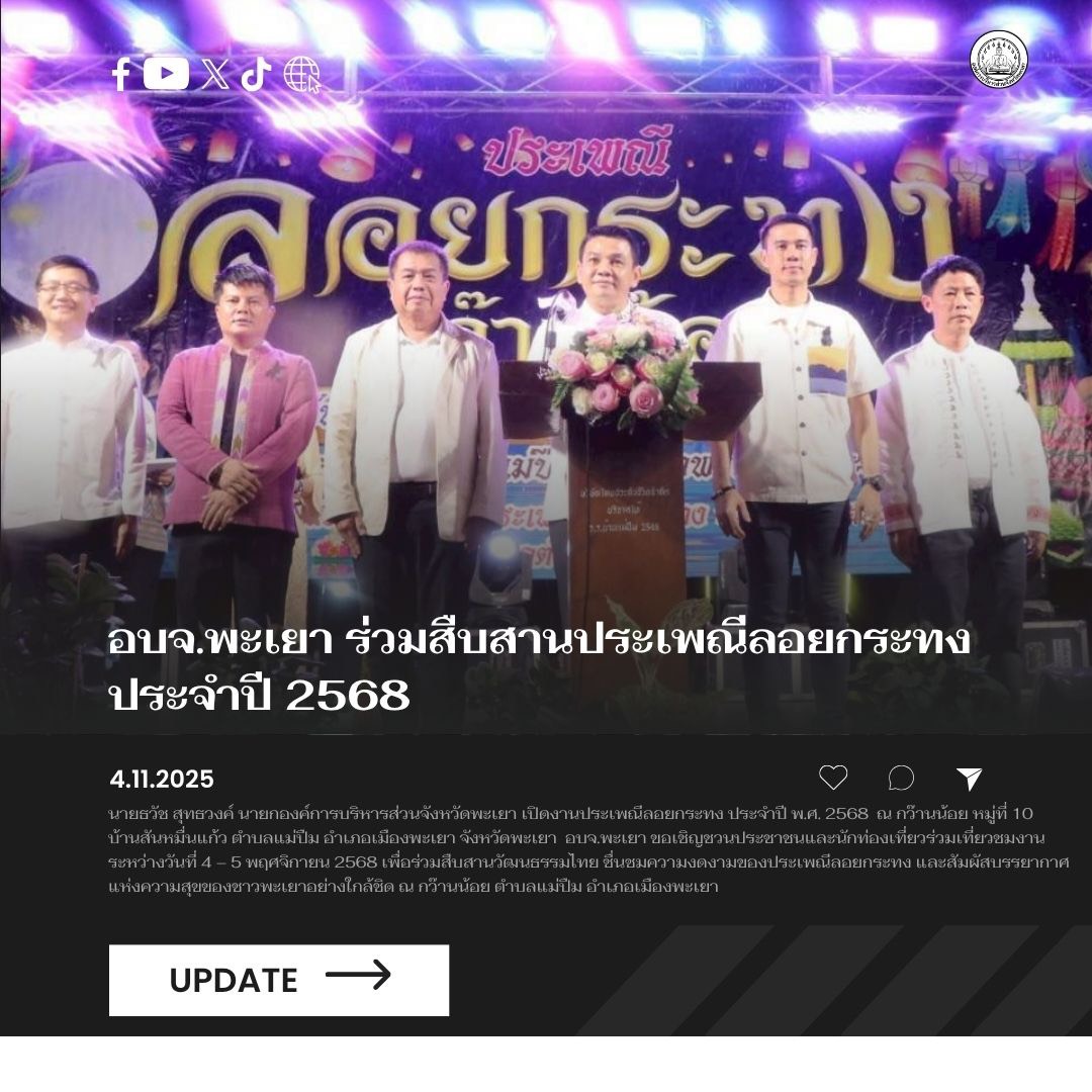 วันที่ 4 พฤศจิกายน 2568 นายธวัช สุทธวงค์ นายกองค์การบริหารส่วนจังหวัดพะเยา เป็นประธานในพิธีเปิดงาน ประเพณีลอยกระทง ประจำปี พ.ศ. 2568 ณ กว๊านน้อย หมู่ที่ 10 บ้านสันหมื่นแก้ว ตำบลแม่ปืม อำเภอเมืองพะเยา จังหวัดพะเยา