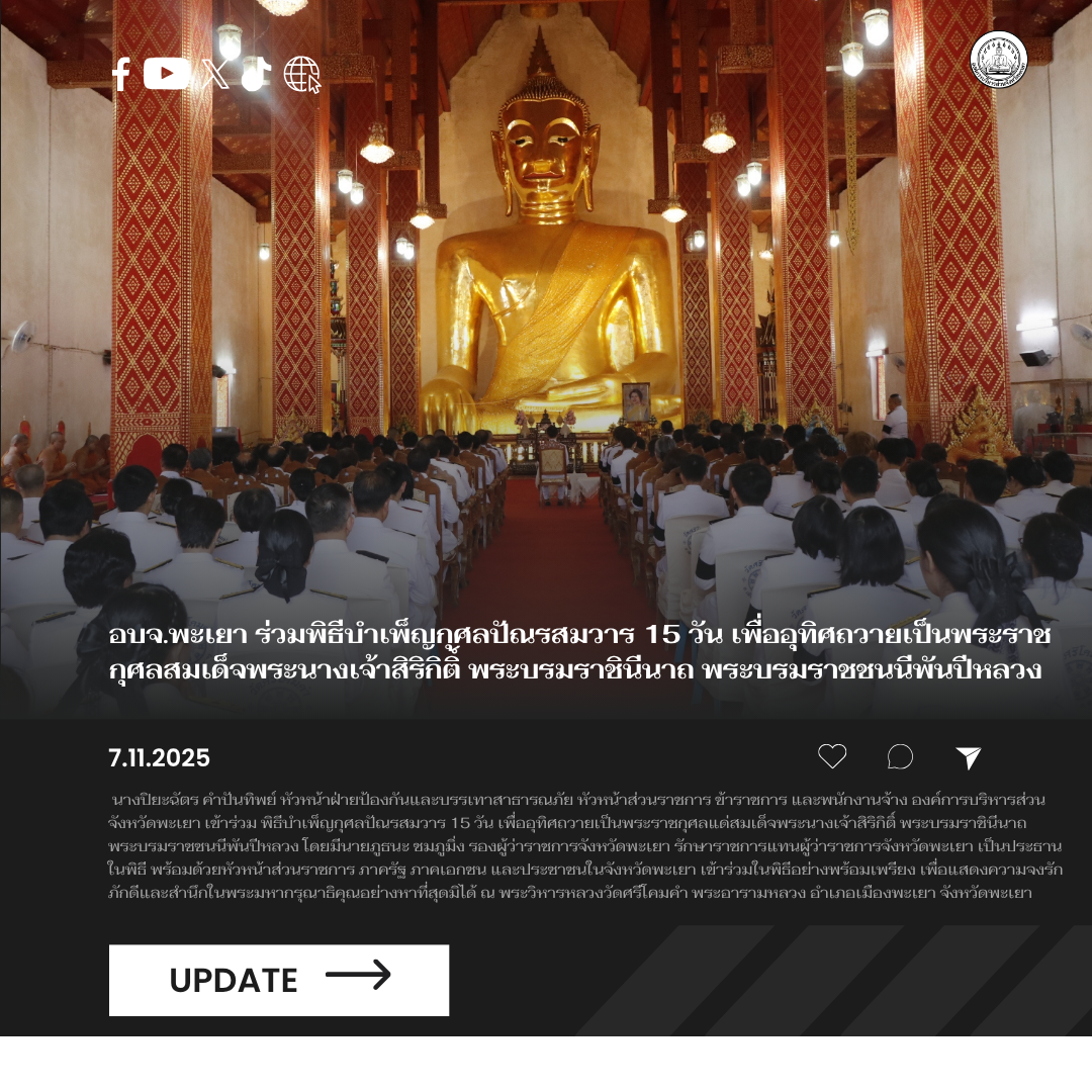 วันที่ 7 พฤษจิกายน 2568 นายธวัช สุทธวงค์ นายกองค์การบริหารส่วนจังหวัดพะเยา มอบหมายให้ นางปิยะฉัตร คำปันทิพย์ หัวหน้าฝ่ายป้องกันและบรรเทาสาธารณภัย หัวหน้าส่วนราชการ ข้าราชการ และพนักงานจ้าง องค์การบริหารส่วนจังหวัดพะเยา เข้าร่วม พิธีบำเพ็ญกุศลปัณรสมวาร 15 วัน เพื่ออุทิศถวายเป็นพระราชกุศลแด่สมเด็จพระนางเจ้าสิริกิติ์ พระบรมราชินีนาถ พระบรมราชชนนีพันปีหลวง โดยมีนายภูธนะ ชมภูมิ่ง รองผู้ว่าราชการจังหวัดพะเยา รักษาราชการแทนผู้ว่าราชการจังหวัดพะเยา เป็นประธานในพิธี พร้อมด้วยหัวหน้าส่วนราชการ ภาครัฐ ภาคเอกชน และประชาชนในจังหวัดพะเยา เข้าร่วมในพิธีอย่างพร้อมเพรียง เพื่อแสดงความจงรักภักดีและสำนึกในพระมหากรุณาธิคุณอย่างหาที่สุดมิได้ ณ พระวิหารหลวงวัดศรีโคมคำ พระอารามหลวง อำเภอเมืองพะเยา จังหวัดพะเยา