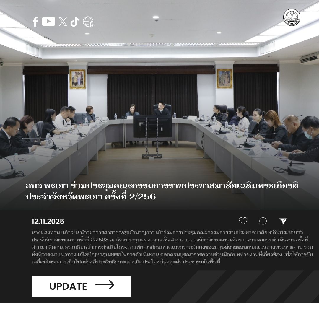 วันที่ 12 พฤศจิกายน 2568 นายธวัช สุทธวงค์ นายกองค์การบริหารส่วนจังหวัดพะเยา มอบหมายให้นางแสงทวน แก้วจิโน นักวิชาการสาธารณสุขชำนาญการ เข้าร่วมการประชุมคณะกรรมการราชประชาสมาสัยเฉลิมพระเกียรติประจำจังหวัดพะเยา ครั้งที่ 2/2568 ณ ห้องประชุมทองกวาว ชั้น 4 ศาลากลางจังหวัดพะเยา เพื่อรายงานผลการดำเนินงานครั้งที่ผ่านมา ติดตามความคืบหน้าการดำเนินโครงการพัฒนาศักยภาพและความมั่นคงของมนุษย์ชายขอบตามแนวทางพระราชทาน รวมทั้งพิจารณาแนวทางแก้ไขปัญหาอุปสรรคในการดำเนินงาน ตลอดจนบูรณาการความร่วมมือกับหน่วยงานที่เกี่ยวข้อง เพื่อให้การขับเคลื่อนโครงการเป็นไปอย่างมีประสิทธิภาพและเกิดประโยชน์สูงสุดต่อประชาชนในพื้นที่