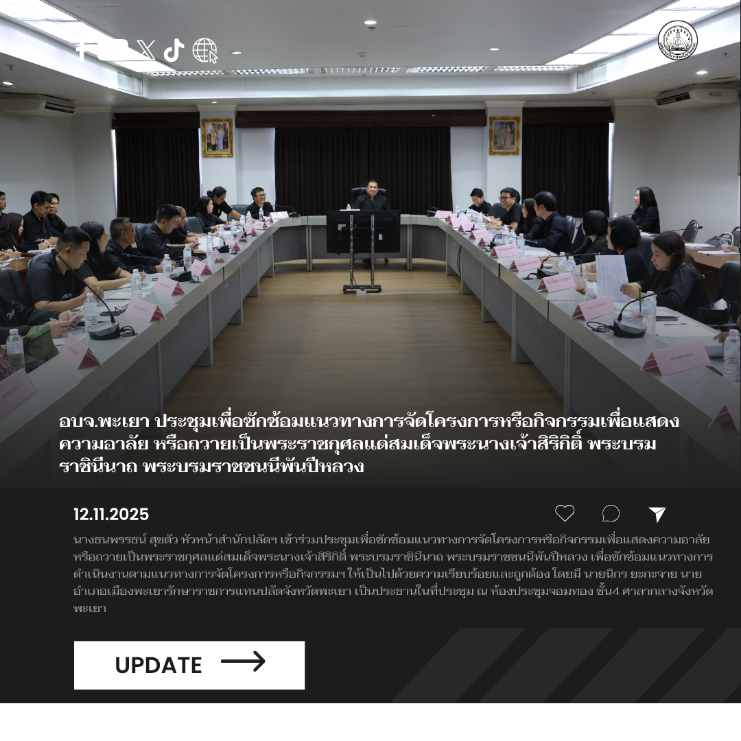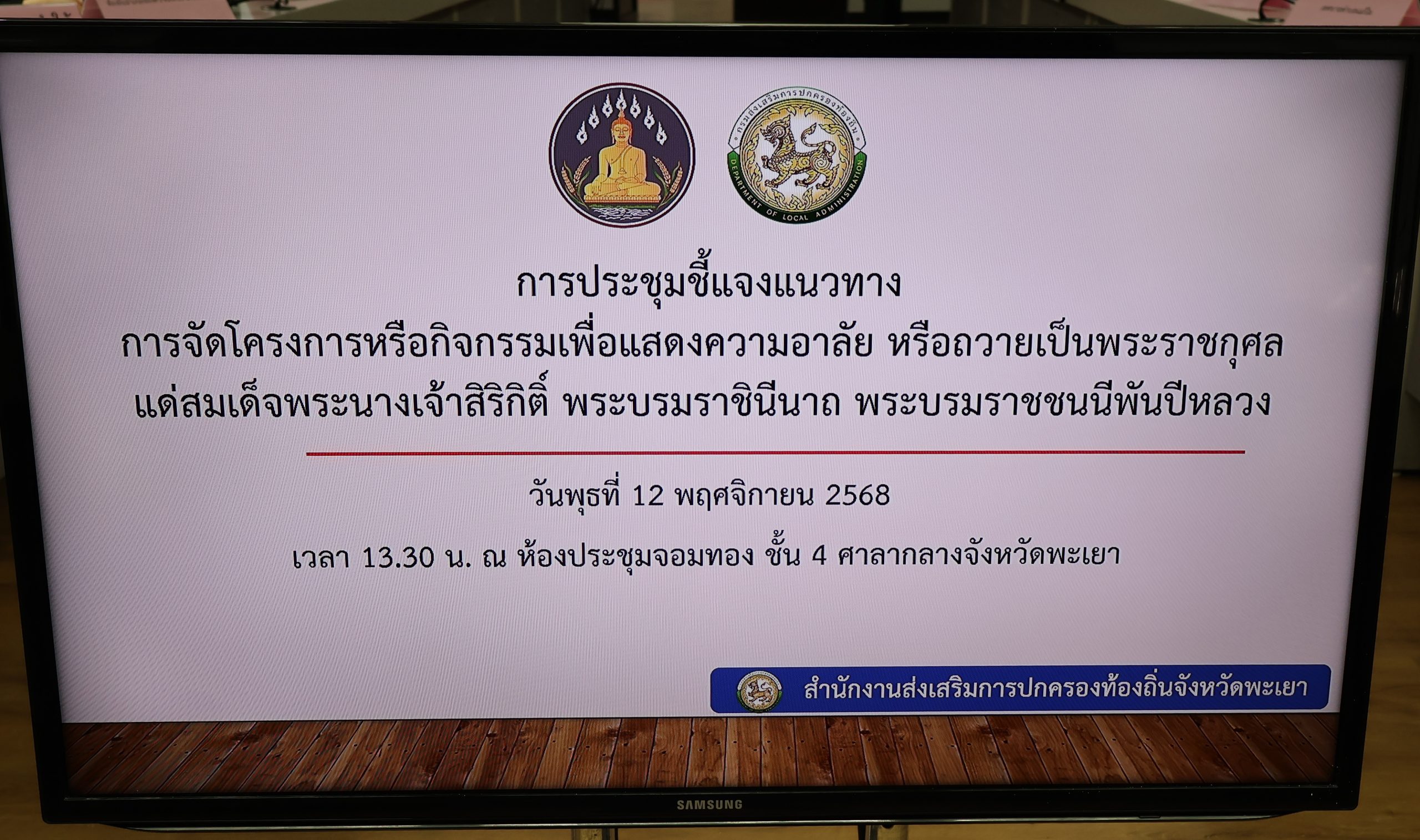 วันที่ 12 พฤศจิกายน 2568 นายธวัช สุทธวงค์ นายกองค์การบริหารส่วนจังหวัดพะเยา ได้มอบหมายให้ นางธนพรรธน์ สุขตัว หัวหน้าสำนักปลัดฯ เข้าร่วมประชุมเพื่อซักซ้อมแนวทางการจัดโครงการหรือกิจกรรมเพื่อแสดงความอาลัย หรือถวายเป็นพระราชกุศลแด่สมเด็จพระนางเจ้าสิริกิติ์ พระบรมราชินีนาถ พระบรมราชชนนีพันปีหลวง เพื่อซักซ้อมแนวทางการดำเนินงานตามแนวทางการจัดโครงการหรือกิจกรรมฯ ให้เป็นไปด้วยความเรียบร้อยและถูกต้อง โดยมี นายนิกร ยะกะจาย นายอำเภอเมืองพะเยารักษาราชการแทนปลัดจังหวัดพะเยา เป็นประธานในที่ประชุม ณ ห้องประชุมจอมทอง ชั้น4 ศาลากลางจังหวัดพะเยา