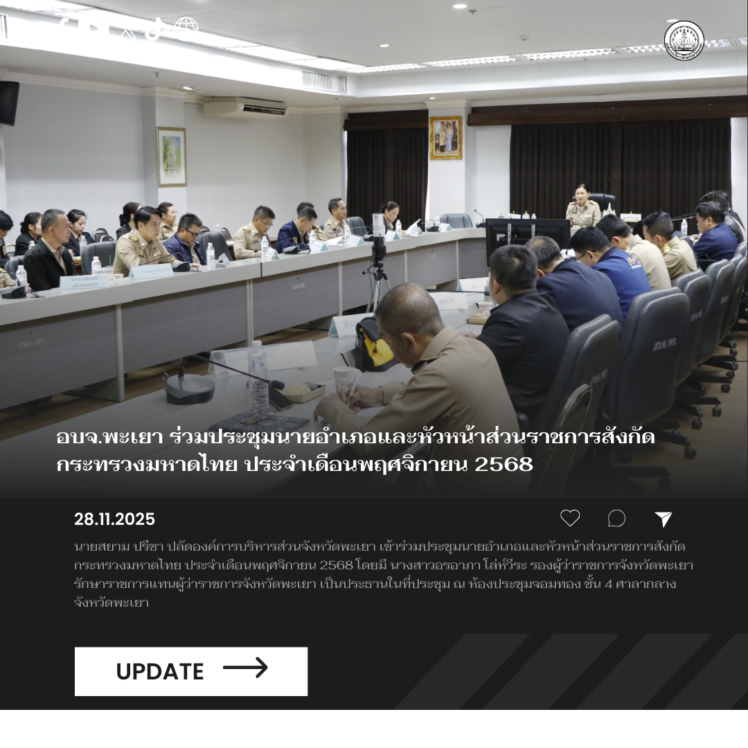 วันที่ 28 พฤศจิกายน 2568 นายธวัช สุทธวงค์ นายกองค์การบริหารส่วนจังหวัดพะเยา มอบหมายให้ นายสยาม ปรีชา ปลัดองค์การบริหารส่วนจังหวัดพะเยา เข้าร่วมประชุมนายอำเภอและหัวหน้าส่วนราชการสังกัดกระทรวงมหาดไทย ประจำเดือนพฤศจิกายน 2568 โดยมี นางสาวอรอาภา โล่ห์วีระ รองผู้ว่าราชการจังหวัดพะเยา รักษาราชการแทนผู้ว่าราชการจังหวัดพะเยา เป็นประธานในที่ประชุม ณ ห้องประชุมจอมทอง ชั้น 4 ศาลากลางจังหวัดพะเยา