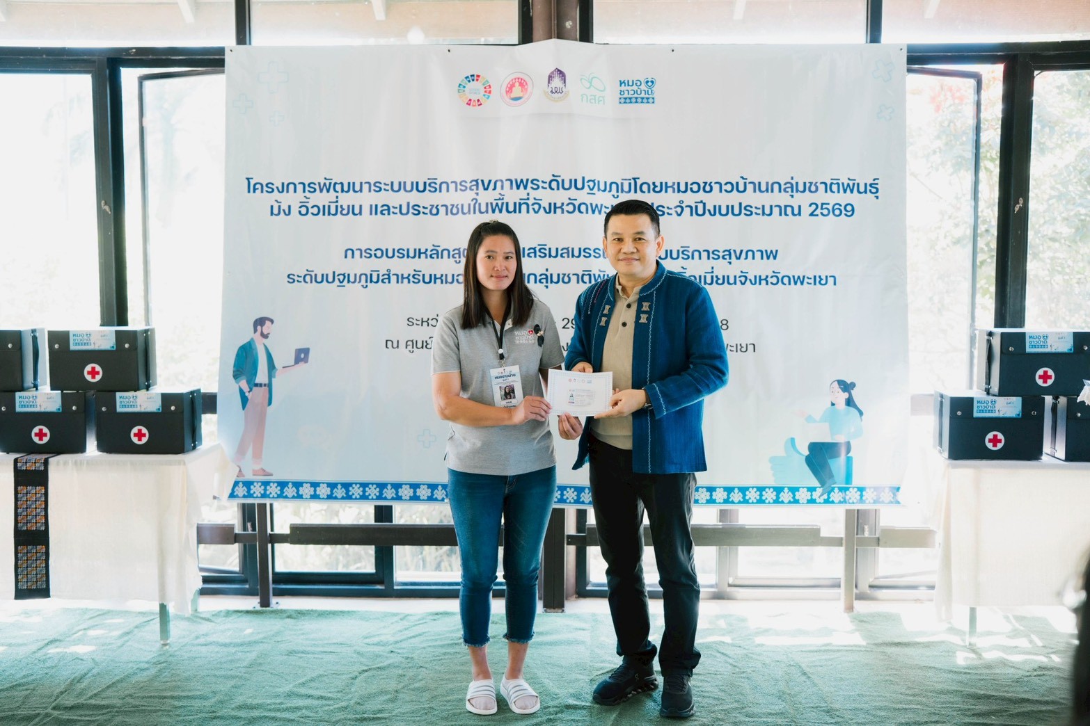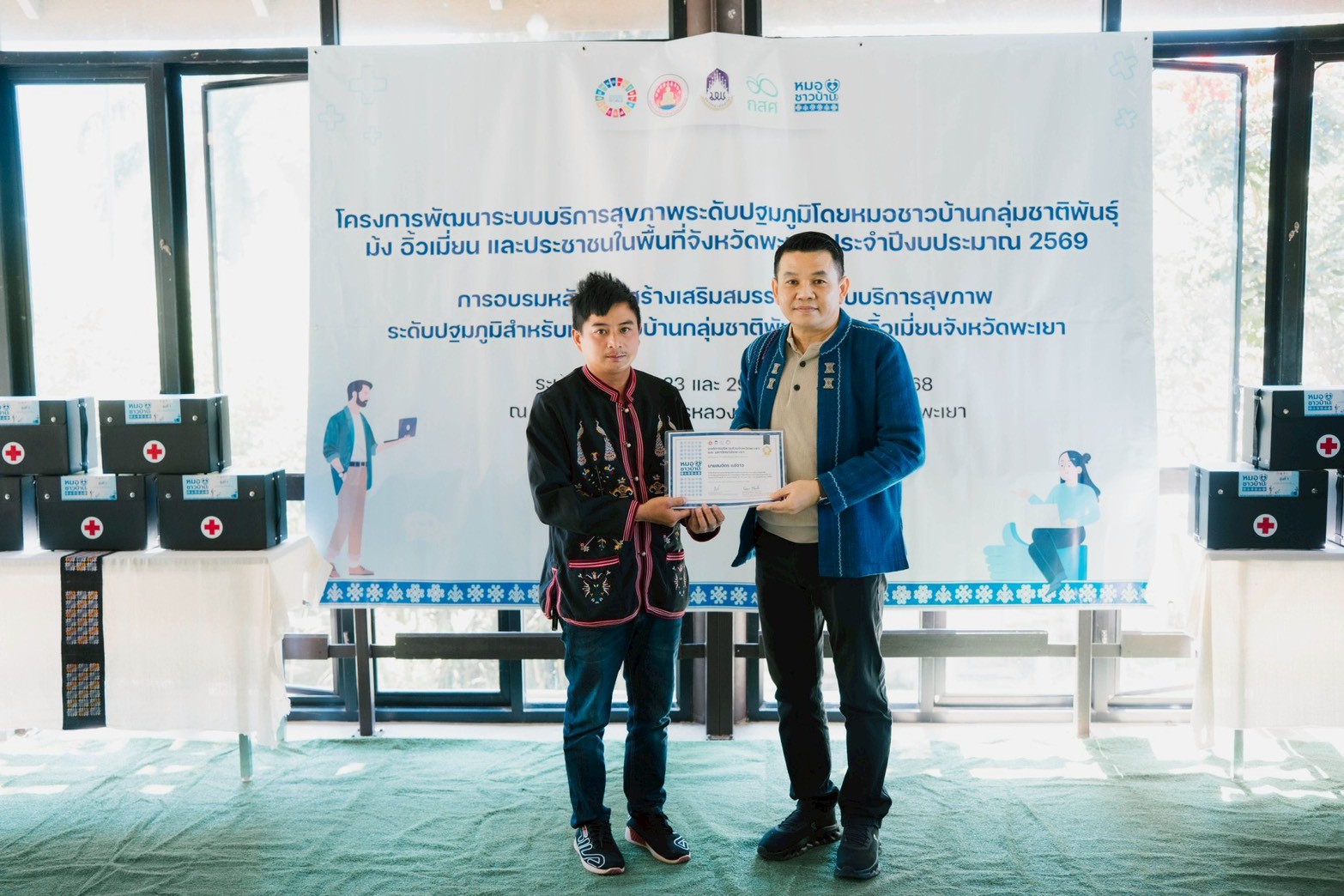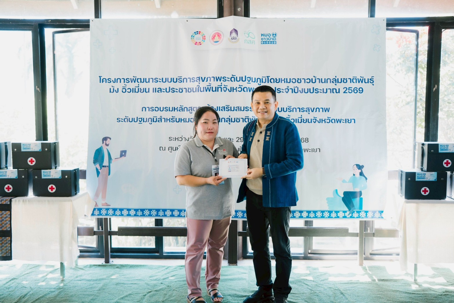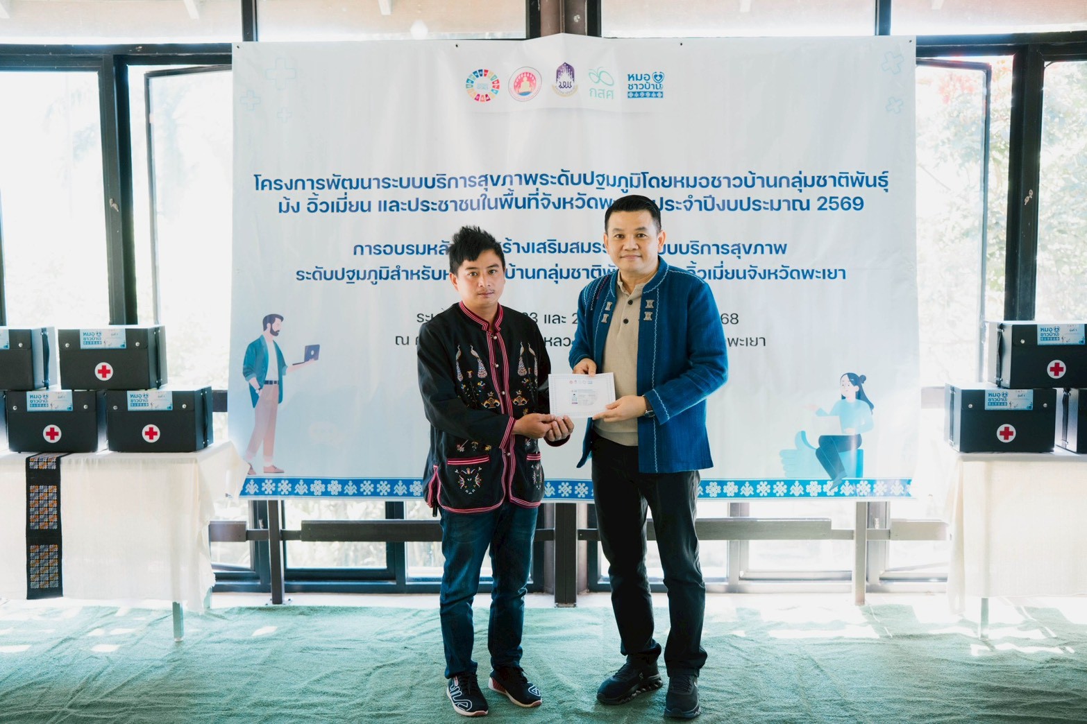 วันอาทิตย์ที่ 30 พฤศจิกายน 2568 นายธวัช สุทธวงค์ นายกองค์การบริหารส่วนจังหวัดพะเยา เป็นประธานในพิธีมอบประกาศนียบัตรแก่ผู้สำเร็จการฝึกอบรมเชิงปฏิบัติการ “หลักสูตรสร้างเสริมสมรรถนะระบบบริการสุขภาพระดับปฐมภูมิสำหรับหมอชาวบ้านกลุ่มชาติพันธุ์ม้งและอิ้วเมี่ยน จังหวัดพะเยา” รุ่นที่ 1 ประจำปีงบประมาณ 2569 ณ ศูนย์พัฒนาโครงการหลวงปังค่า โดยมีคณะผู้บริหาร อบจ.พะเยา คณาจารย์คณะสาธารณสุขศาสตร์ มหาวิทยาลัยพะเยา และผู้อำนวยการ รพ.สต. ในพื้นที่ร่วมเป็นเกียรติในพิธี