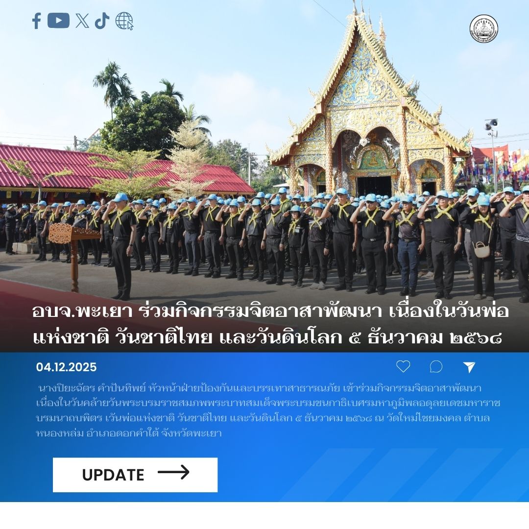 วันที่ ๔ ธันวาคม ๒๕๖๘ นายธวัช สุทธวงค์ นายกองค์การบริหารส่วนจังหวัดพะเยา มอบหมายให้ นางปิยะฉัตร คำปันทิพย์ หัวหน้าฝ่ายป้องกันและบรรเทาสาธารณภัย เข้าร่วมกิจกรรมจิตอาสาพัฒนา เนื่องในวันคล้ายวันพระบรมราชสมภพพระบาทสมเด็จพระบรมชนกาธิเบศรมหาภูมิพลอดุลยเดชมหาราช บรมนาถบพิตร เวันพ่อแห่งชาติ วันชาติไทย และวันดินโลก ๕ ธันวาคม ๒๕๖๘ เพื่อแสดงออกถึงความจงรักภักดีและน้อมรำลึกในพระมหากรุณาธิคุณของ พระบาทสมเด็จพระบรมชนกาธิเบศร มหาภูมิพลอดุลยเดชมหาราช บรมนาถบพิตร เนื่องในวันคล้ายวันพระบรมราชสมภพ วันที่ ๕ ธันวาคม ณ วัดใหม่ไชยมงคล ตำบลหนองหล่ม อำเภอดอกคำใต้ จังหวัดพะเยา