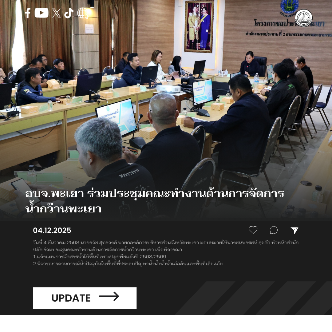 วันที่ 4 ธันวาคม 2568 นายธวัช สุทธวงค์ นายกองค์การบริหารส่วนจังหวัดพะเยา มอบหมายให้นางธนพรรธน์ สุขตัว หัวหน้าสำนักปลัด ร่วมประชุมคณะทำงานด้านการจัดการน้ำกว๊านพะเยา เพื่อพิจารณา