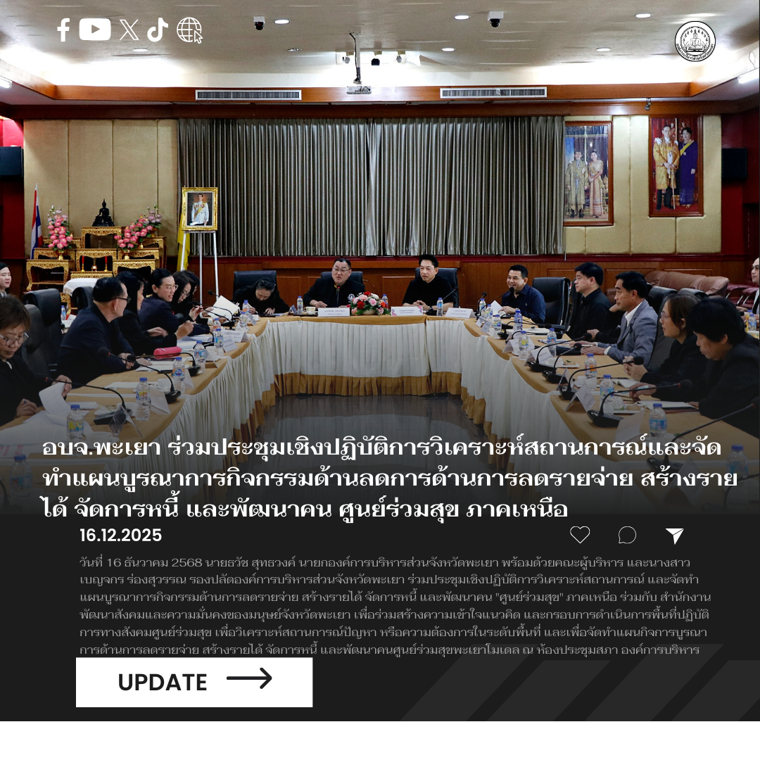 วันที่ 16 ธันวาคม 2568 นายธวัช สุทธวงค์ นายกองค์การบริหารส่วนจังหวัดพะเยา พร้อมด้วยคณะผู้บริหาร และนางสาวเบญจกร ร่องสุวรรณ รองปลัดองค์การบริหารส่วนจังหวัดพะเยา ร่วมประชุมเชิงปฏิบัติการวิเคราะห์สถานการณ์ และจัดทำแผนบูรณาการกิจกรรมด้านการลดรายจ่าย สร้างรายได้ จัดการหนี้ และพัฒนาคน “ศูนย์ร่วมสุข” ภาคเหนือ ร่วมกับ สำนักงานพัฒนาสังคมและความมั่นคงของมนุษย์จังหวัดพะเยา เพื่อร่วมสร้างความเข้าใจแนวคิด และกรอบการดำเนินการพื้นที่ปฏิบัติการทางสังคมศูนย์ร่วมสุข เพื่อวิเคราะห์สถานการณ์ปัญหา หรือความต้องการในระดับพื้นที่ และเพื่อจัดทำแผนกิจการบูรณาการด้านการลดรายจ่าย สร้างรายได้ จัดการหนี้ และพัฒนาคนศูนย์ร่วมสุขพะเยาโมเดล ณ ห้องประชุมสภา องค์การบริหารส่วนจังหวัดพะเยา