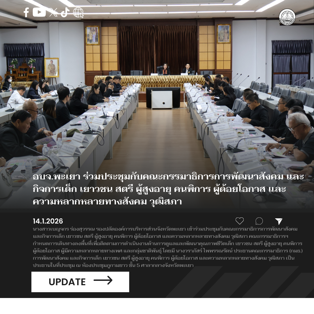 วันที่ 14 มกราคม 2569 นายธวัช สุทธวงค์ นายกองค์การบริหารส่วนจังหวัดพะเยา มอบหมายให้ นางสาวเบญจกร ร่องสุวรรณ รองปลัดองค์การบริหารส่วนจังหวัดพะเยา เข้าร่วมประชุมกับคณะกรรมาธิการการพัฒนาสังคม และกิจการเด็ก เยาวชน สตรี ผู้สูงอายุ คนพิการ ผู้ด้อยโอกาส และความหลากหลายทางสังคม วุฒิสภา คณะกรรมาธิการฯ กำหนดการเดินทางลงพื้นที่เพื่อติดตามการดำเนินงานด้านการดูแลและพัฒนาคุณภาพชีวิตเด็ก เยาวชน สตรี ผู้สูงอายุ คนพิการ ผู้ด้อยโอกาส ผู้มีความหลากหลายทางเพศ และกลุ่มชาติพันธุ์